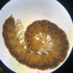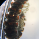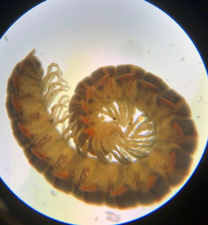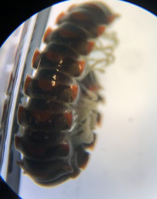 | Observations | Segmented grey/brownish body Orange separating each segment Orange spots on each side and middle of each segment Cream colored legs |