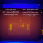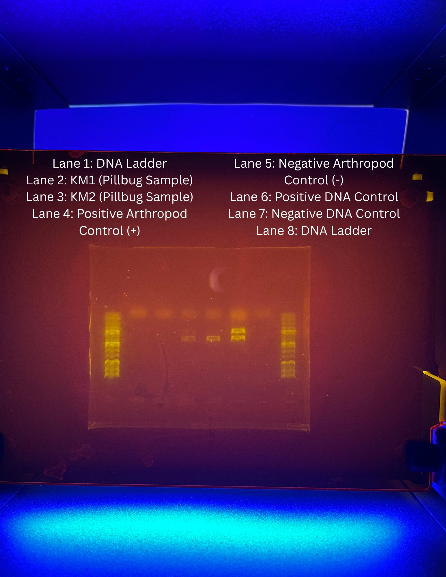 Low confidence, samples did not yield any data after gel electrophoresis. Lane 1: DNA Ladder Lane 2: KM1, no bands present Lane 3: KM2, no bands present Lane 4:(+) Arthropod Control, bands present at 438bp and 708bp Lane 5: (-) Arthropod Control, bands present at 708bp Lane 6: (+) DNA Control, bands present at 438bp and 708bp Lane 7: (-) DNA Control (Water), no bands present Lane 8: DNA Ladder |