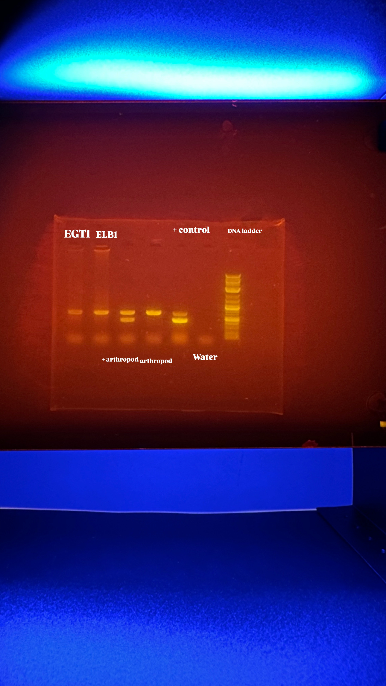 | Protocol notes | For DNA extraction we could have incubated for longer than we did. Incubation time was 1 minute and we didn’t set an exact timer. Other than that, the protocol was followed. The Taq polymerase used were the New England Biolabs One Taq Hot Start. For PCR with the arthropod primers the annealing temp was 49C. Updated: For the duplex PCR the annealing temp was 49C. The Taq polymerase used-NEB OneTaq Hot Start Quick-Load 2x MM w/stand. Date we set up second PCR reaction is 3/26/25. Updated 4/2/25: Taq polymerase used: New England Biolabs OneTaq Hot Start Quick-Load 2x MM w/ Standard Buffer DNA Ladder Used: New England Biolabs 1 kb Plus DNA Ladder for Safe Stains |
