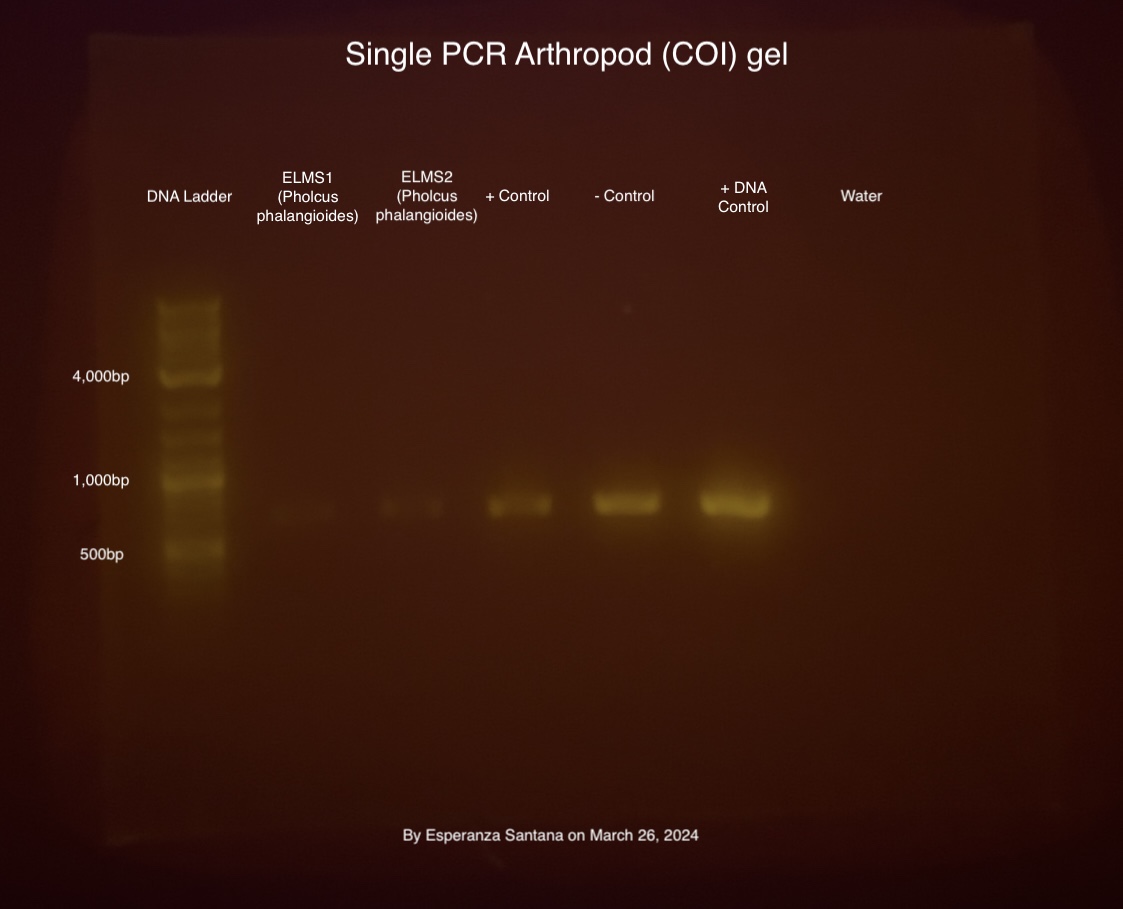 | Explanation of confidence level | I am moderately confident that my species are arthropods and are negative for Wolbachia. The positive and negative controls such as the arthropod controls, dna controls, and water control – all showed proper bandage across both PCRs to support my conclusion. I am not highly confident of either PCR because of the faint bands in ELMSPCR1 which could indicate a false negative in ELMSPCR2. With proper time and equipment, PCRs could be redone and a more confident conclusion could be made. As of now with the information at hand, both Pholcus phalangioides most likely have the Arthropod CO1 gene and are negative for the presence of Wolbachia 16S gene. |