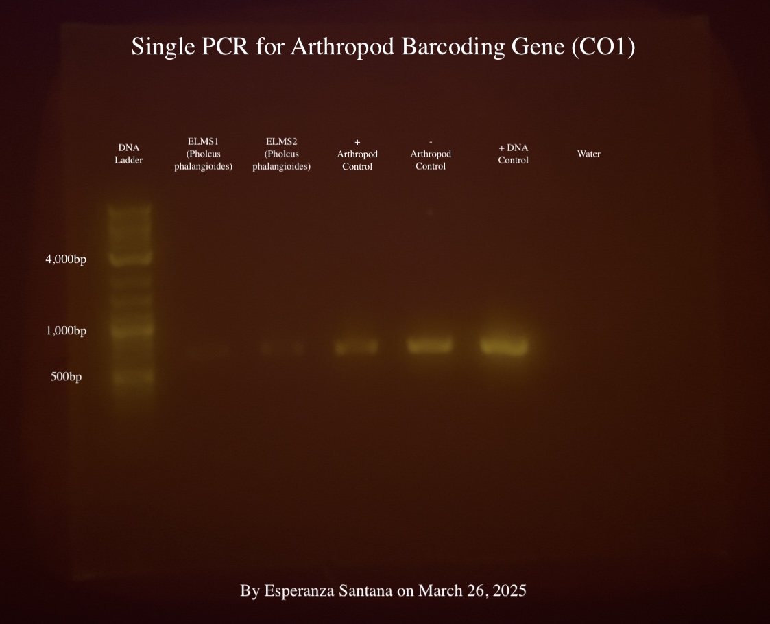 | Explanation of confidence level | I am moderately confident that my species are arthropods and are negative for Wolbachia. The positive and negative controls such as the arthropod controls, dna controls, and water control – all showed proper bandage across both PCRs to support my conclusion. I am not highly confident of either PCR because of the faint bands in ELMSPCR1 which could indicate a false negative in ELMSPCR2. With proper time and equipment, PCRs could be redone and a more confident conclusion could be made. As of now with the information at hand, both Pholcus phalangioides most likely have the Arthropod CO1 gene and are negative for the presence of Wolbachia 16S gene. |