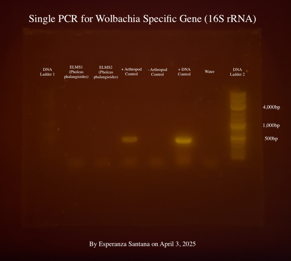 | Protocol notes | A single PCR (ELMSPCR1) was done on ELMS1 and ELMS2 (separate data entry for specimen ELMS2 but all testing, extractions, and PCRs were done together) in order to find the Arthropod Barcoding Gene (CO1) on March 26, 2025. The expected band size was 708bp with an annealing temperature of 49 degrees celsius. The taq polymerase used was NEB OneTaq Hot Start Quick-Load 2x MM w/ Stand. Buffer (M0488S). The DNA Ladder used was NEB 1 kb Plus DNA Ladder for Safe Stains (product # N0559S). Primes used to amplify a 708-bp fragment of the CO1 gene were Arthropod_F (LCO1490) and Arthropod_R (HCO2198). Images of the PCR are attached above labeled, “Single PCR Arthropod CO1 (ELMSPCR1).” A single PCR (ELMSPCR2) was done on ELMS1 and ELMS2 (separate data entry for specimen ELMS2 but all testing, extractions, and PCRs were done together) in order to find the Wolbachia Specific Gene (16S rRNA) on March 27, 2025. The expected band size was 438bp with an annealing temperature of 55 degrees celsius. The taq polymerase used was NEB OneTaq Hot Start Quick-Load 2x MM w/ Stand. Buffer (M0488S). The DNA Ladder used was NEB 1 kb Plus DNA Ladder for Safe Stains (product # N0559S). Primers to specifically amplify a 438-bp fragment of the 16S rRNA gene were Wolbachia_F (16S_WspecF) and Wolbachia_R (16S_WspecR). Images of the PCR are attached above labeled, “Single PCR Wolbachia 16S (ELMSPCR2).” |