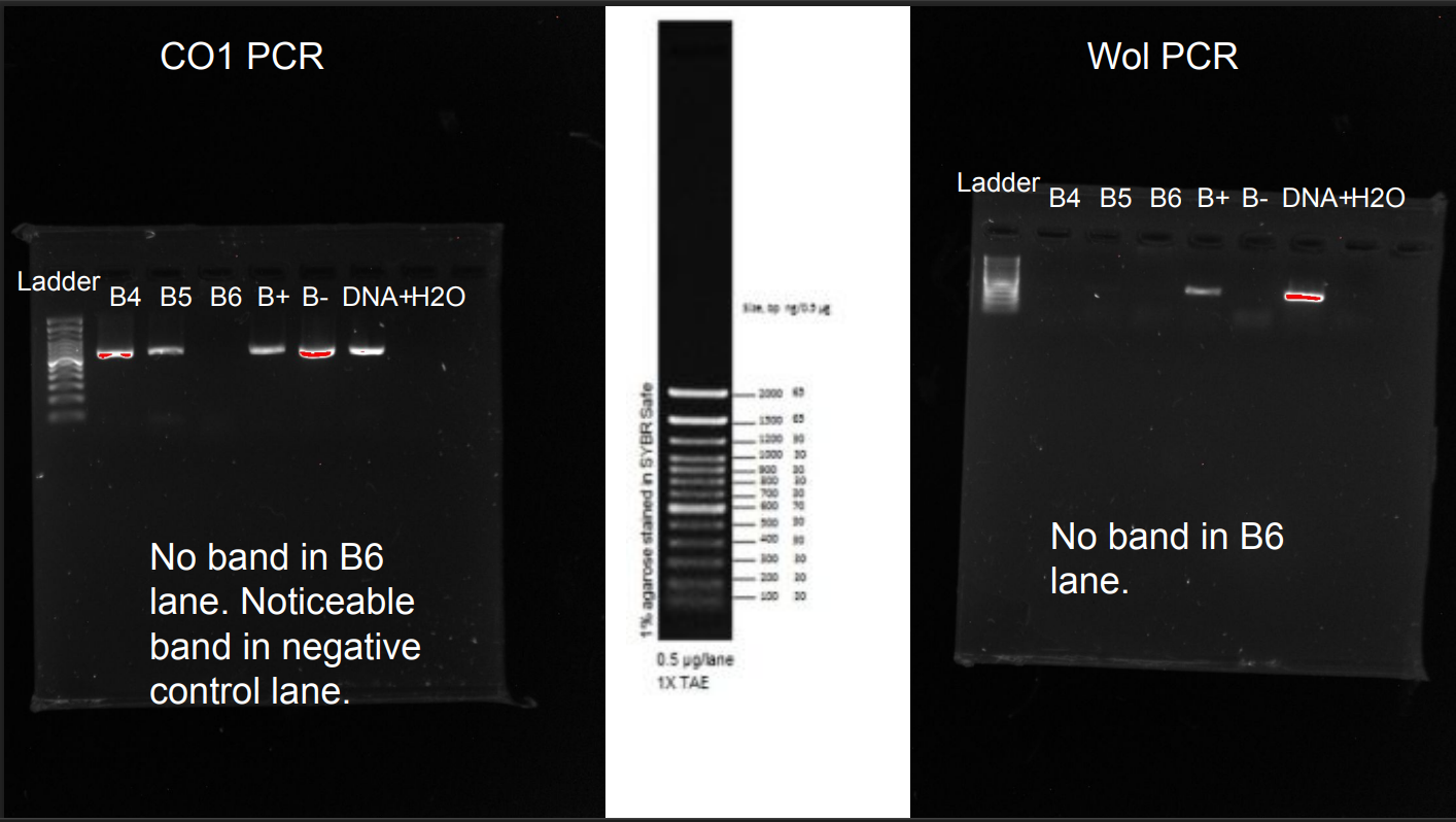 | Explanation of confidence level | First, the negative control showed up, which could mean some error in our protocol or materials. Also, in the co1 gel, my sample’s band (sampleB6), which checked if the DNA was from an arthropod, did not show up, leading to my low confidence level, as other results would be inconclusive if my sample did indeed not include arthropod DNA. |