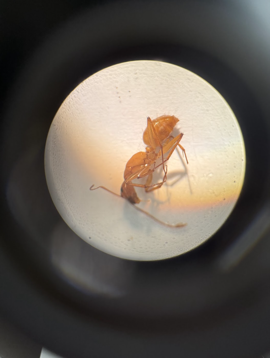 | Observations | The carpenter ant was caught on a rock in front of the school that was near the soil. It was late winter, at around 45 F, with clouds and some wind blowing. It is red and it has 2 long antennae. It has short hair strands coming off of its body. It has 6 legs. |