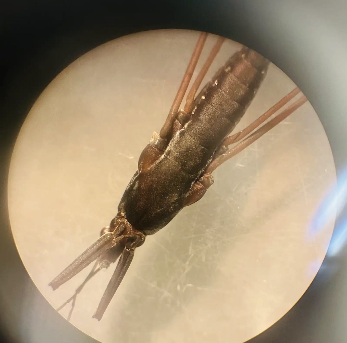 | Observations | It was collected on the Indian Run Stream bend, floating on the water. Late winter, 52 degrees Fahrenheit, and my arthropod is big and black and has one long body with four legs in the back and two legs coming out in the front. |