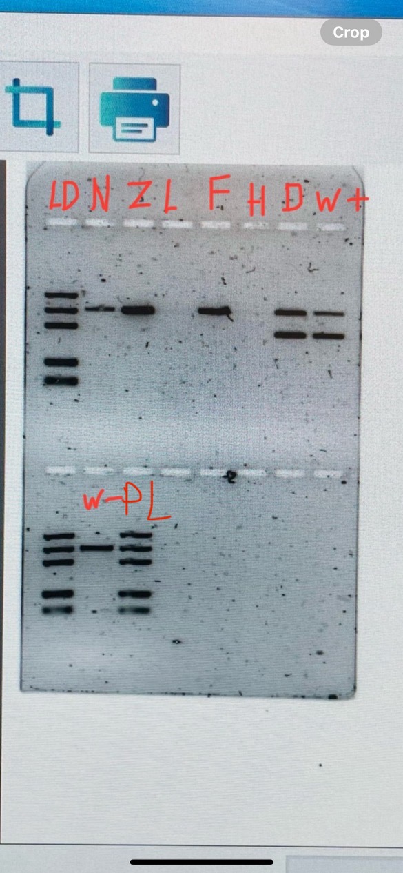 | Protocol notes | The control placing is switched compared to the protocol. For clarification the gel image is correctly labeled with the controls and my arthropod is labeled N, Control labels: W- = negative, W+ = Positive, H= water (-) control, D= DNA + Wolbachia DNA (+) Control, LD= DNA ladders, the other’s are my groupmates. |