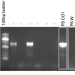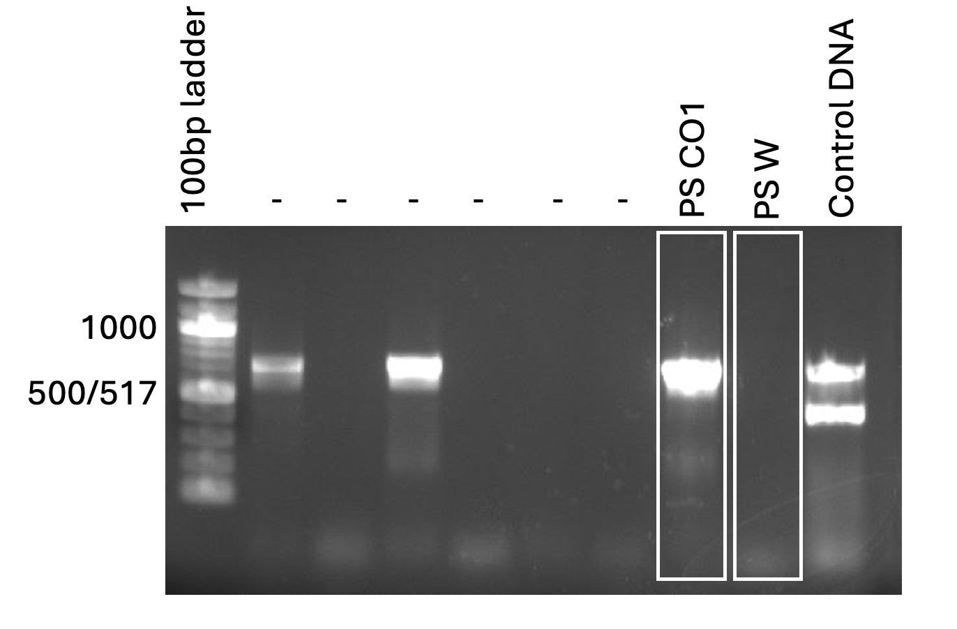 | Protocol notes | DNA extraction: The abdominal contents were removed and crushed thoroughly. Gel electrophoresis lanes for CO1 arthropod and Wolbachia 16S rRNA PCR: 1: 1000bp ladder 2-7: other people’s DNA 8: arthropod primers 9: Wolbachia primers 10: control DNA All of the controls worked. |
