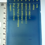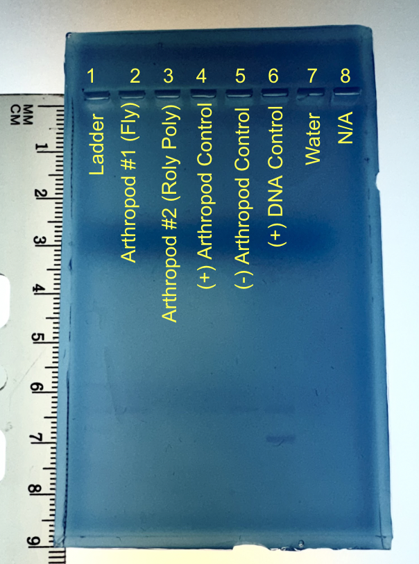 | Protocol notes | The arthropods were caught and then ground to proceed to the DNA extraction and purification process. We did come across an issue with our second arthropod sample containing the pill bug, as the exoskeleton was not removed to lessen the risk of being unable to extract sufficient DNA. This led to our spin column being clogged for a significant amount of time, which we fixed by moving the sample around with a pipette tip. However, this might have decreased the efficiency of our DNA sample. Once our experimental and control samples were prepped, we moved on to the PCR protocol. Samples and our PCR cocktail were added to each of our PCR tubes, which were then put into our MiniOne PCR machine. Finally, loading dye was added to the separated portions of our PCR samples and was loaded into our gel. Our final gel was stained with 100X Fast Blast and put onto a light box for imaging. |