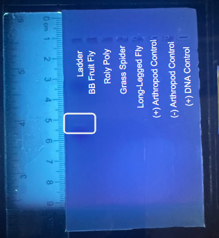 | Protocol notes | DNA Extraction: The arthropod was crushed thoroughly to ensure proper extraction of DNA. Gel Electrophoresis Lanes for Arthropod Gel: 1 – PCR molecular ruler (ladder) 2 – Black-Bodies Fruit Fly 3 – Roly Poly 4 – Grass Spider 5 – Long-Legged Fly 6 – (+) Arthropod Control 7 – (-) Arthropod Control 8 – (+) DNA Control Analysis: Our controls worked confirming our trial worked correctly and we had bands confirming that our insect samples are arthropods. Gel Electrophoresis Lanes for Wolbachia Gel: 1 – PCR molecular ruler (ladder) 2 – Black-Bodies Fruit Fly 3 – Roly Poly 4 – Grass Spider 5 – Long-Legged Fly 6 – (+) Arthropod Control 7 – (-) Arthropod Control 8 – (+) DNA Control Analysis: Our did not work meaning our trial was not successful and there were no bands on our gel except for our ladder meaning that our run is inconclusive most likely due to Wolbachia primers not working correctly. |