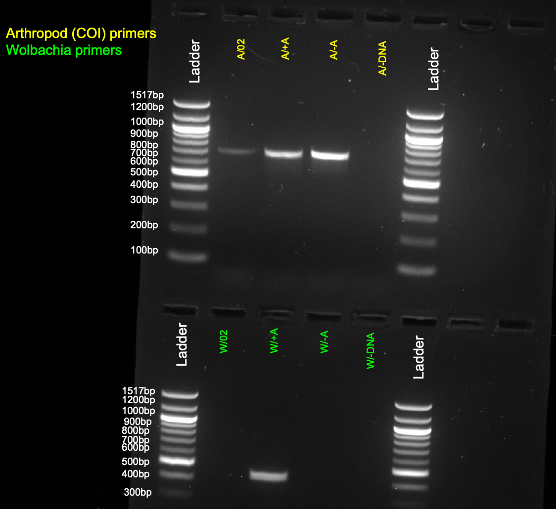 | Protocol notes | Extract the DNA using the DNeasy (Qiagen) blood and tissue kit, and then amplify the Arthropod COI gene and the potential Wolbachia gene using PCR. After DNA was amplified, it was stained with SYBR Safe and run through a gel. Then, samples that had bands for COI or Wolbachia were purified using the QIAquick PCR Purification kit and sent out for sequencing. |