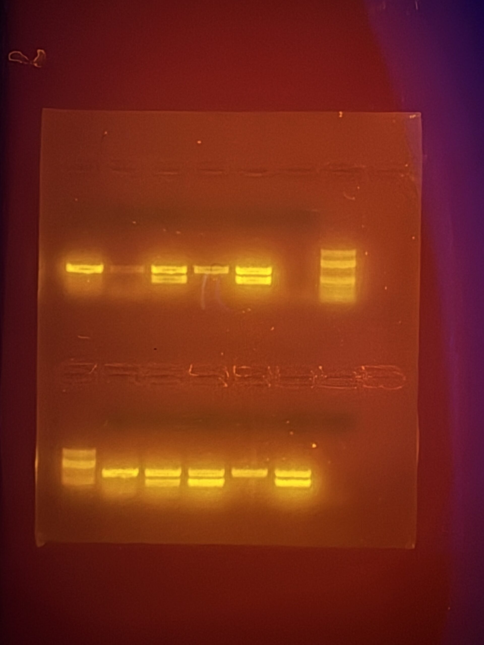| Protocol notes | Lane 1: Arthropod 1 Wol + COI1 -> Crab Spider Lane 2: Arthropod 2 Wol + COI1 -> Yellow jacket Lane 3: Wol (+) Wol + COI1 Lane 4: Wol (-) Wol +COI1 Lane 5. gDNA control Wol +COI1 Lane 6: Water Control Wol + COI1 Lane 7: DNA Standard Taq Polymerase: GoTaq Master Mix: measured in Microliters