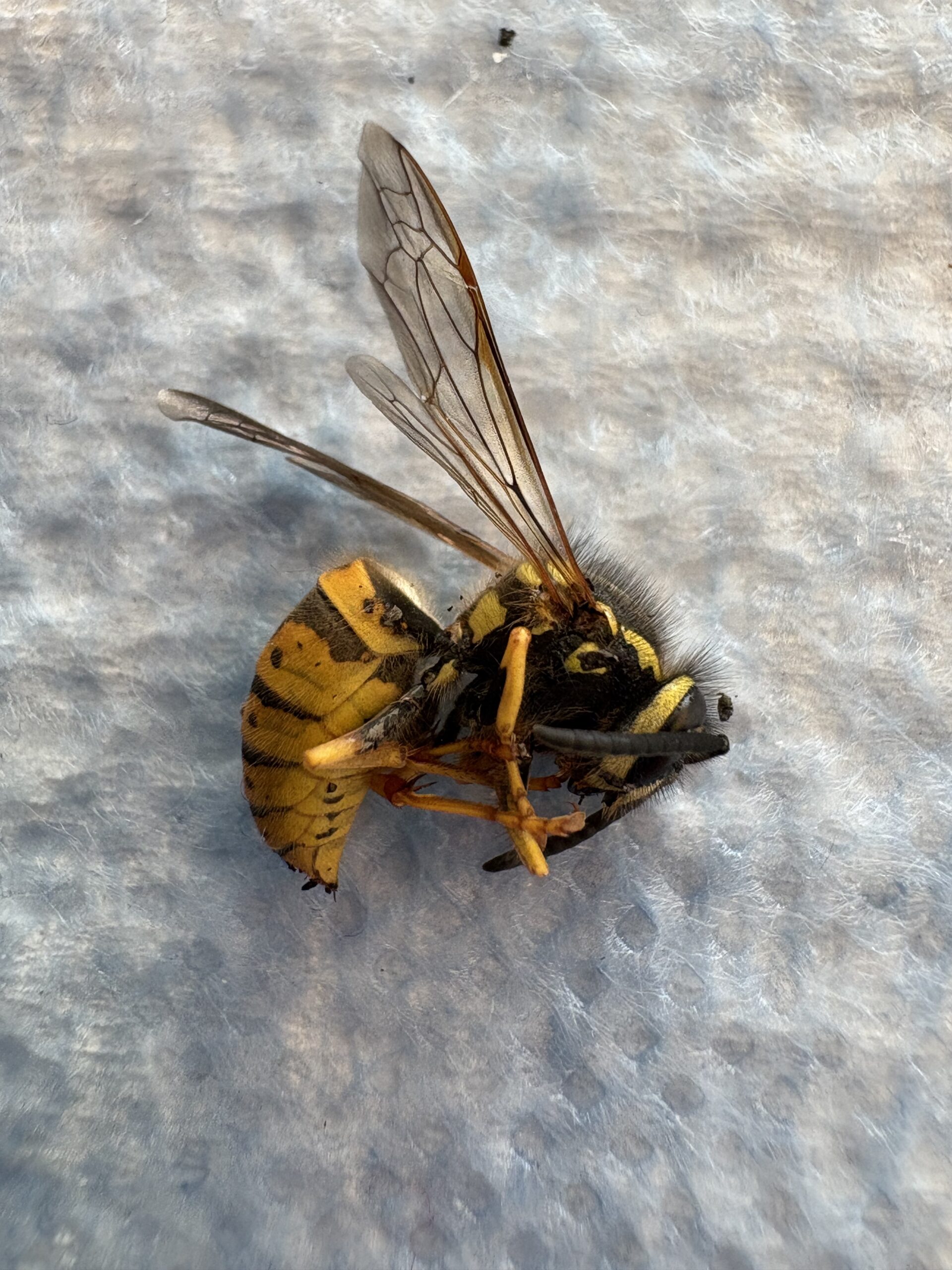 | Observations | Hand caught while predating on a Honeybee in a flowered mulch patch. Placed into plastic sandwich bag and frozen for 20 minutes after capture. Average sized Yellow Jacket with stripped and spotted thorax. Two bronze-colored wings attached to the abdomen. stinger not visible on specimen. Also processes two antennae protruding from the head and 6 legs attached to the abdomen. |