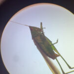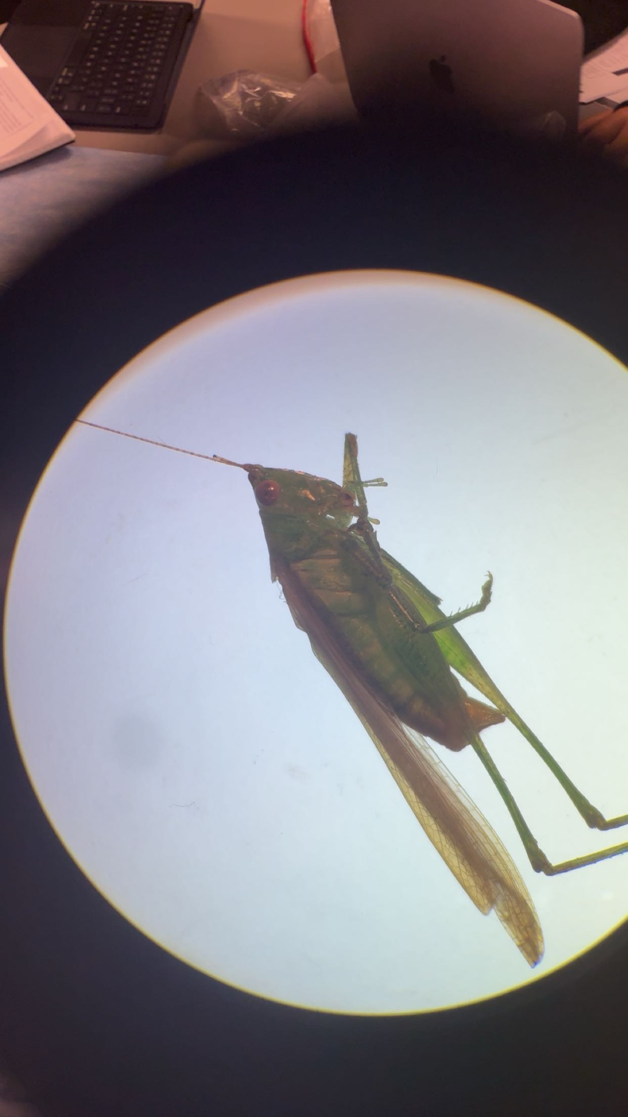 | Observations | Caught with net in a larger forest area. It was in a bush. Anthropod is green, roughly inch in length. One antenna is visibly broken off. When collected, grasshopper made loud buzzing noise. |