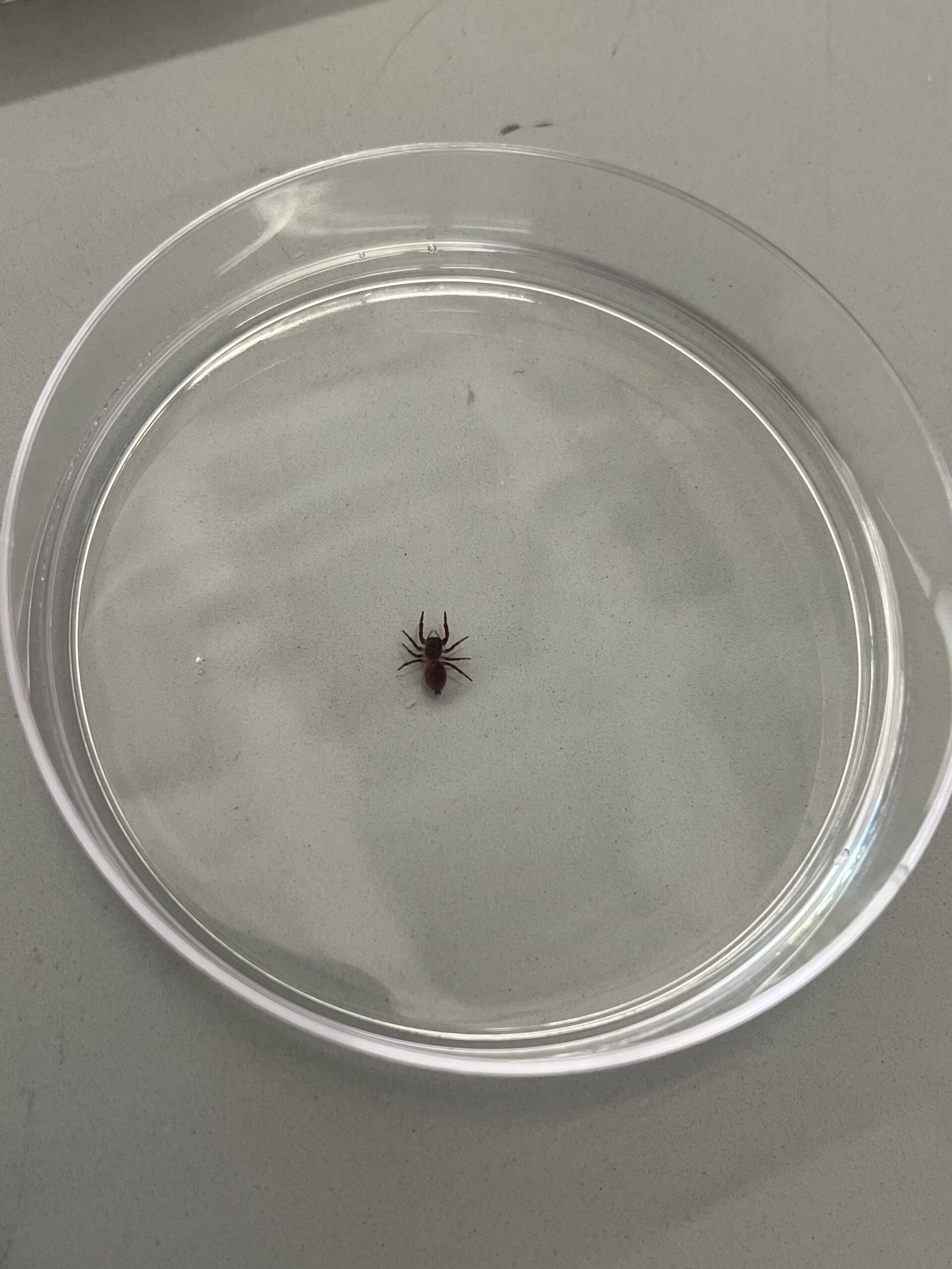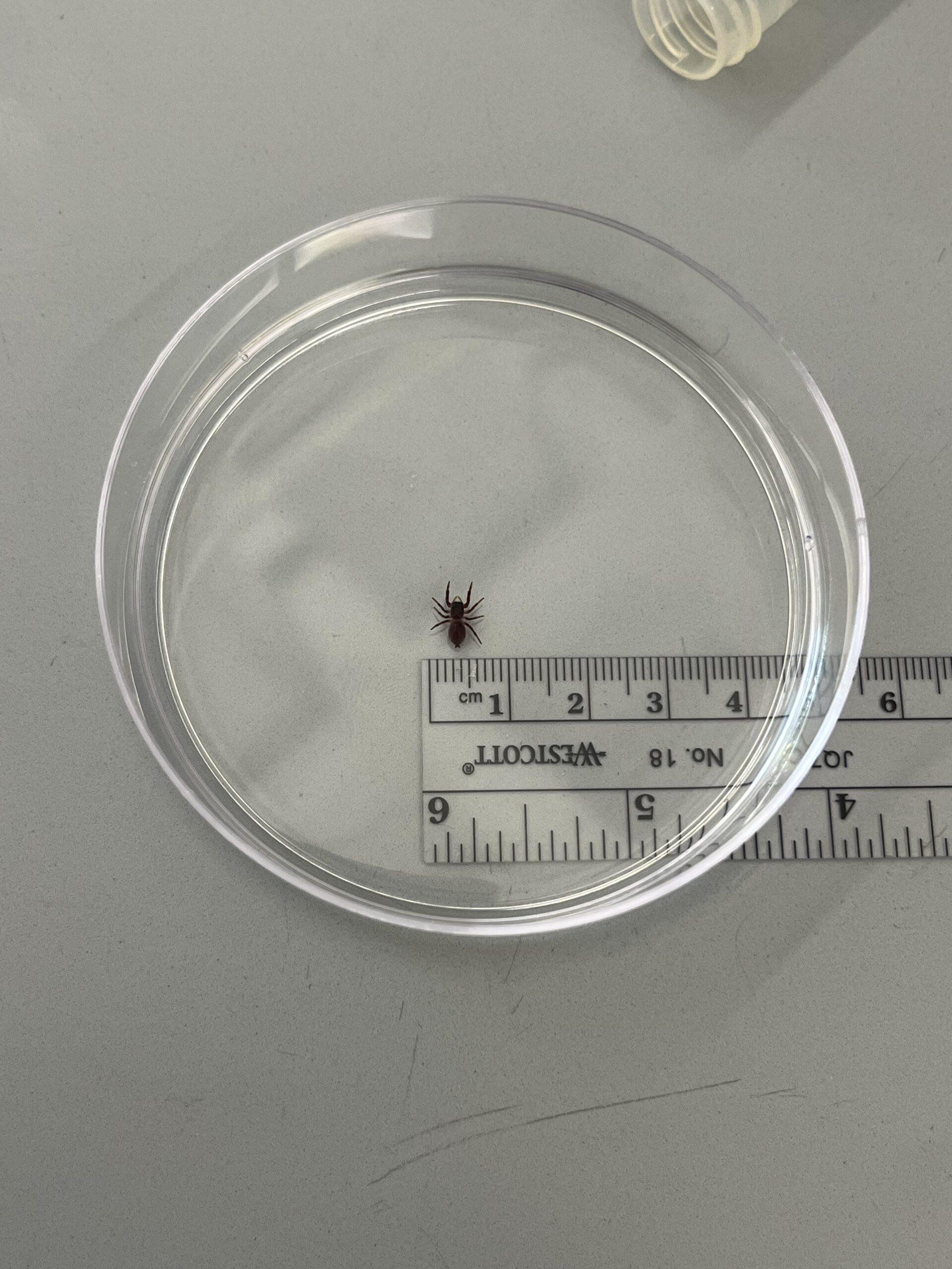 | Observations | When collected, arthropod was hanging off a branch of a red oak tree in my backyard (a more rural area). When first collected, color was more gray. After putting in alcohol to preserve, turn more of a dark red color. |