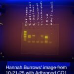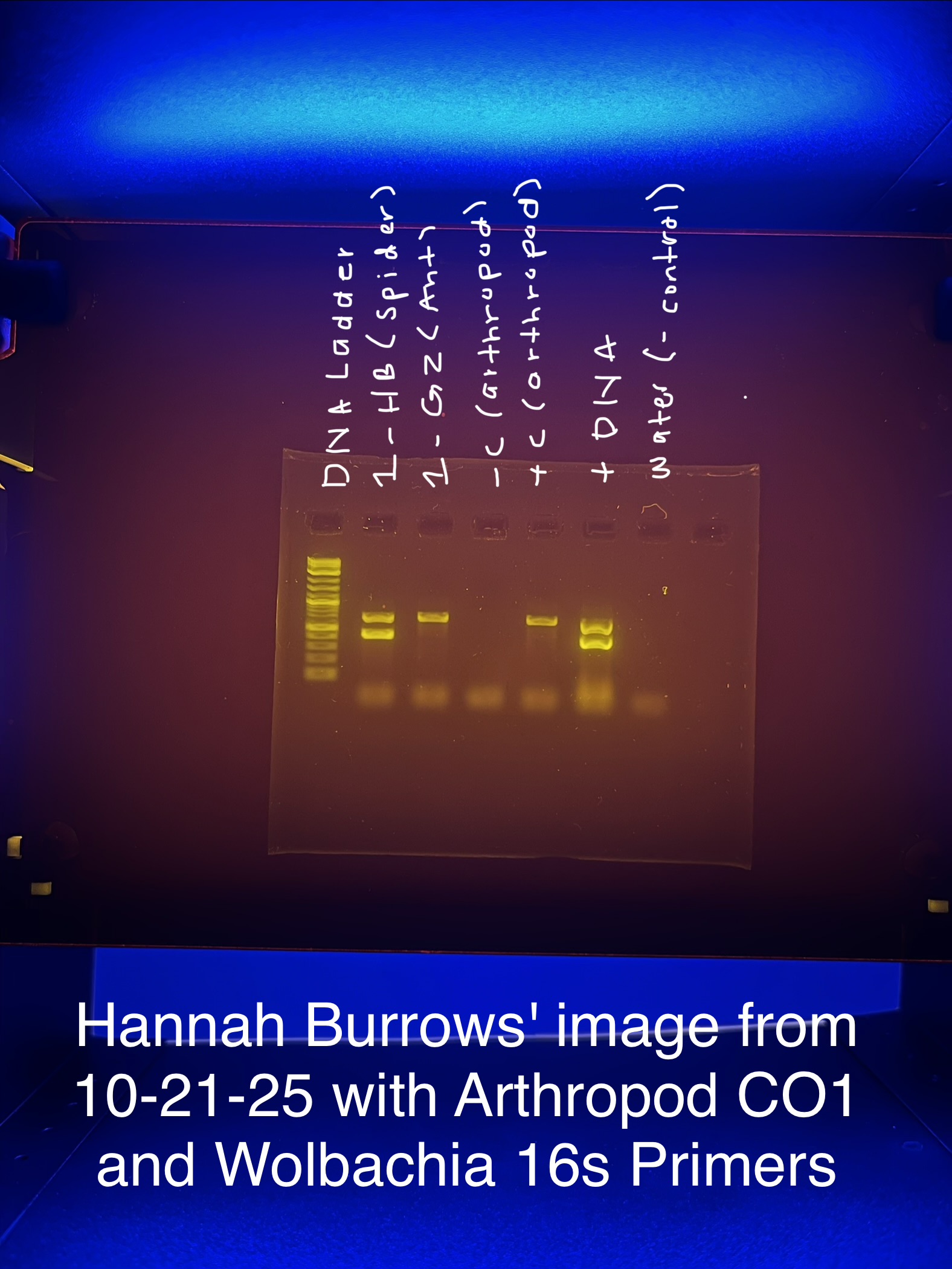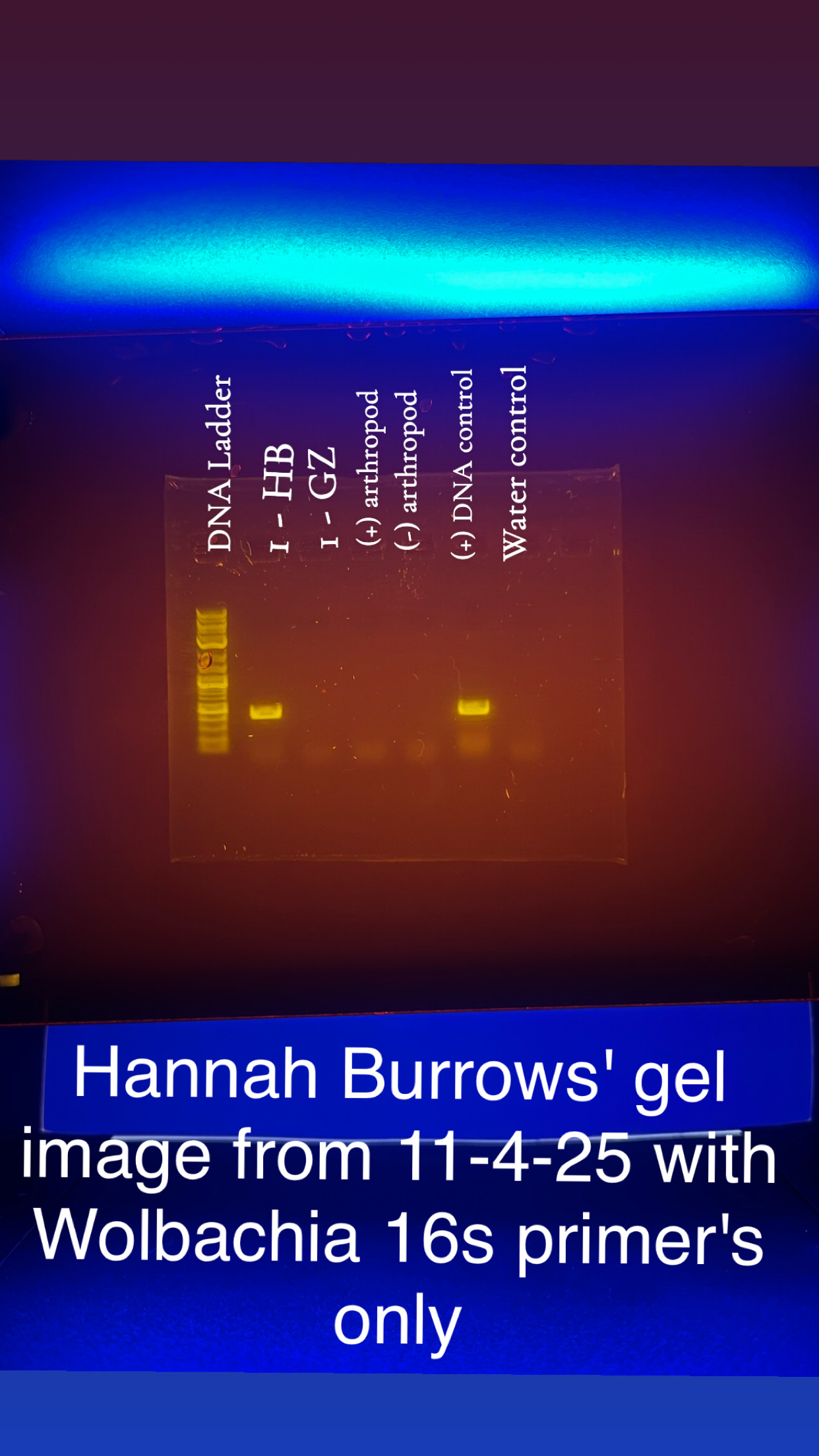 | Protocol notes | We used a DNA extraction protocol based on the insect adaptation of New England biolabs’ monarch spin gDNA Extraction kit (product #T3010) The specimen was incubated for 30 minutes in a hot water bath at 56 degrees C Our first PCR reaction was set up on 10/14/25. It was a duplex reaction because we used both the Arthropod CO1 and Wolbachia 16S primers together. The annealing temperature was 49 degrees C. We used this Taq polymerase: New England Biolabs OneTaq Hot Start Quick-Load 2X Master Mix with Standard Buffer (#M0488S). The only difference from written protocol was that we used 88 ul of Taq Master Mix instead of 87.5. Our first Gel image was taken on 10/21/25 and was run at 125 volts for 22 minutes. The DNA Ladder used was New England Biolabs 1 kb Plus DNA Ladder for safe stains (product #N0559S) Our second PCR reaction was set up on 10/28/25, used the same taq polymerase as the first PCR reaction and: was a single PCR reaction that used the wolbachia 16s primers, used an annealing temperature of 55 degrees Celsius, the only thing we did differently from the standard protocol is that we used 88 ul of taq polymerase. Our second gel image was taken on 11-4-25 and was run at 125 volts for 27 minutes. The DNA Ladder used was New England Biolabs 1 kb Plus DNA Ladder for Safe Stains (product #N0559S) |