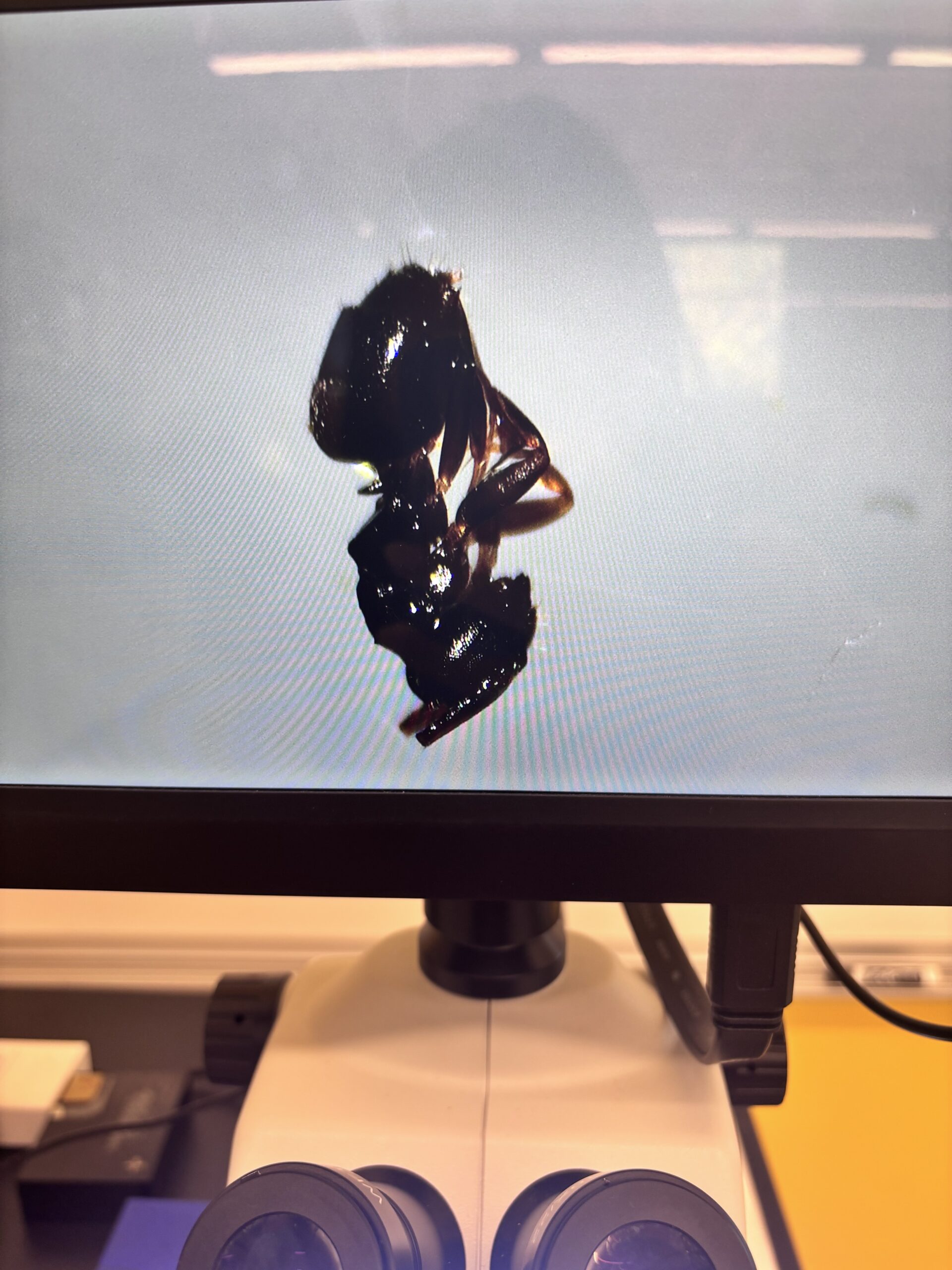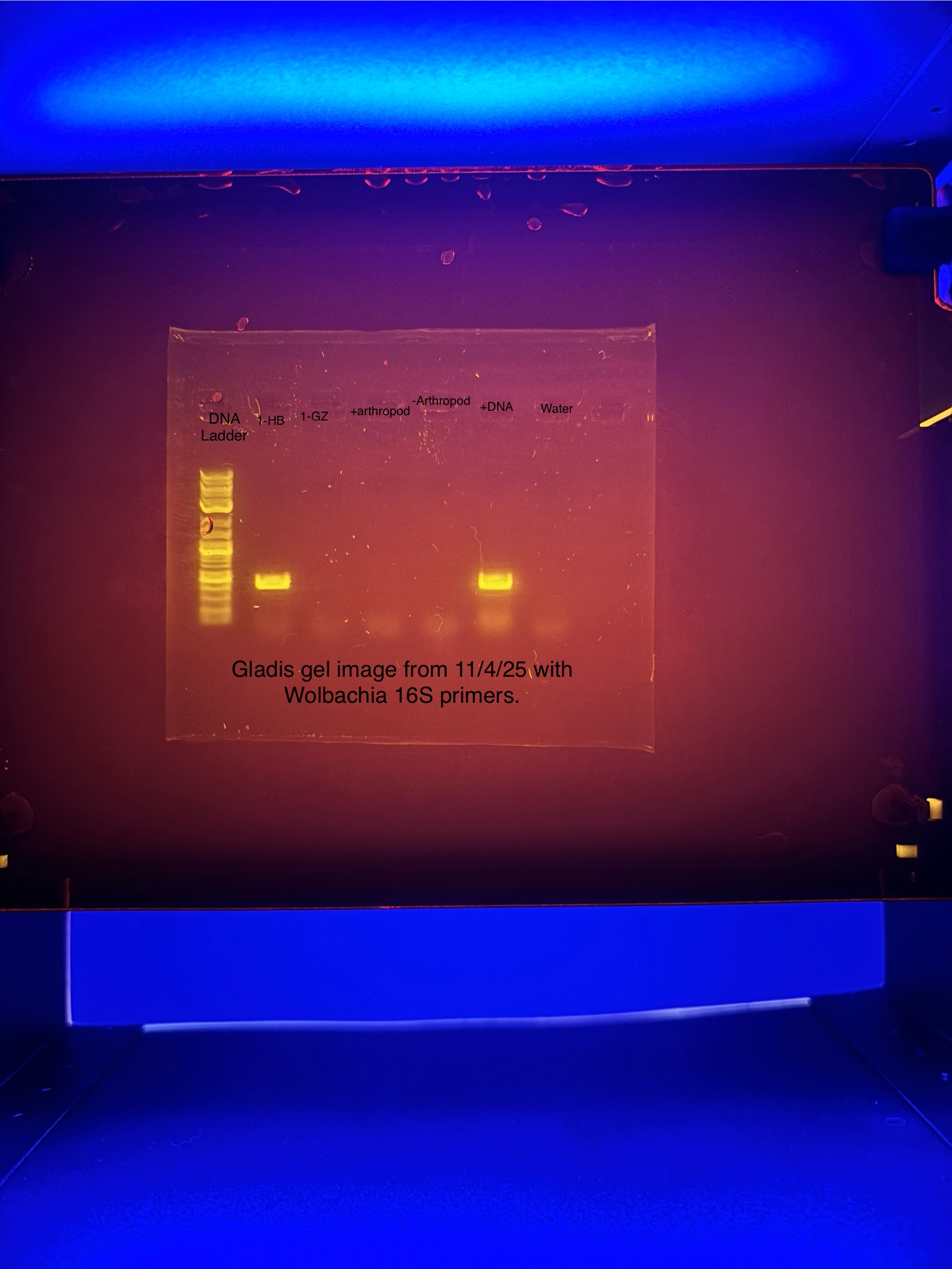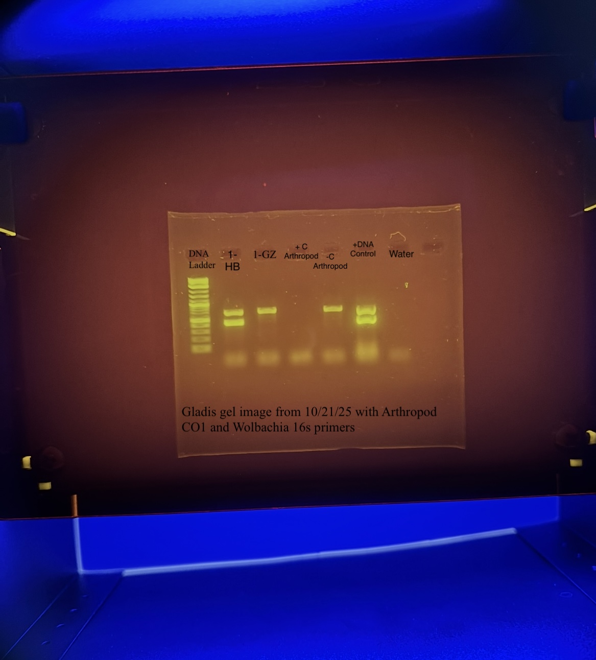 | Protocol notes | We used a dna extraction protocol based on the insect adaptation of New England biolabs monarch spin gDNA extraction kit (product #T3010) the specimen was incubated for 30 minutes in a hot water bath at 56 degrees C. Our first PCR was set up on 10/14/25 and was a duplex reaction because we used both the arthropod CO1 and Wolbachia 16S Primers together. Used an annealing temperature of 49 degrees Celsius. Used this TAQ polymerase: New England Biolabs OneTaq Hot start Quick Load 2X Master Mix with standard buffer (#M0488S). Our first gel image was taken on 10/21/25 and was run at 125 volts for 22 minutes. Used this DNA Ladder : New England Biolabs 1 kb Plus DNA Ladder for safe stains (product #N0559S) Our second PCR reaction was set on 10/28/25 used the same Taq polymerase as the first PCR reaction, and was a single reaction that used Wolbachia F and R primers. Used an annealing temperature of 55 degrees Celsius. Our second gel image was taken on 11/4/25 and was run at 125 volts for 27 minutes. |