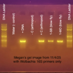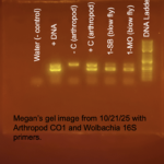 For our second gel electrophoresis my confidence level for my arthropod being Wolbachia positive is very confident. I got the same exact results as my first gel electrophoresis except for I only did a single PCR targeting the Wolbachia primers. My controls also showed up how they were supposed to, therefore my data received is accurate.