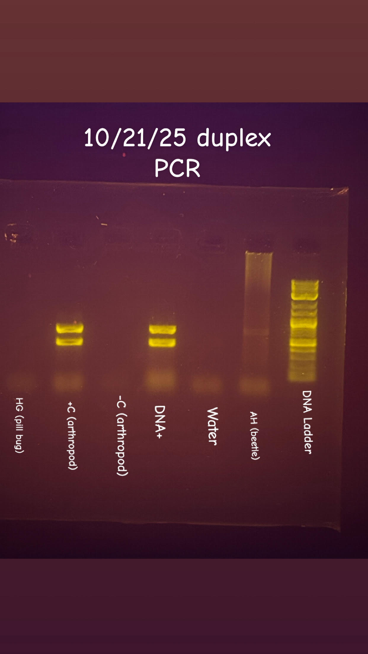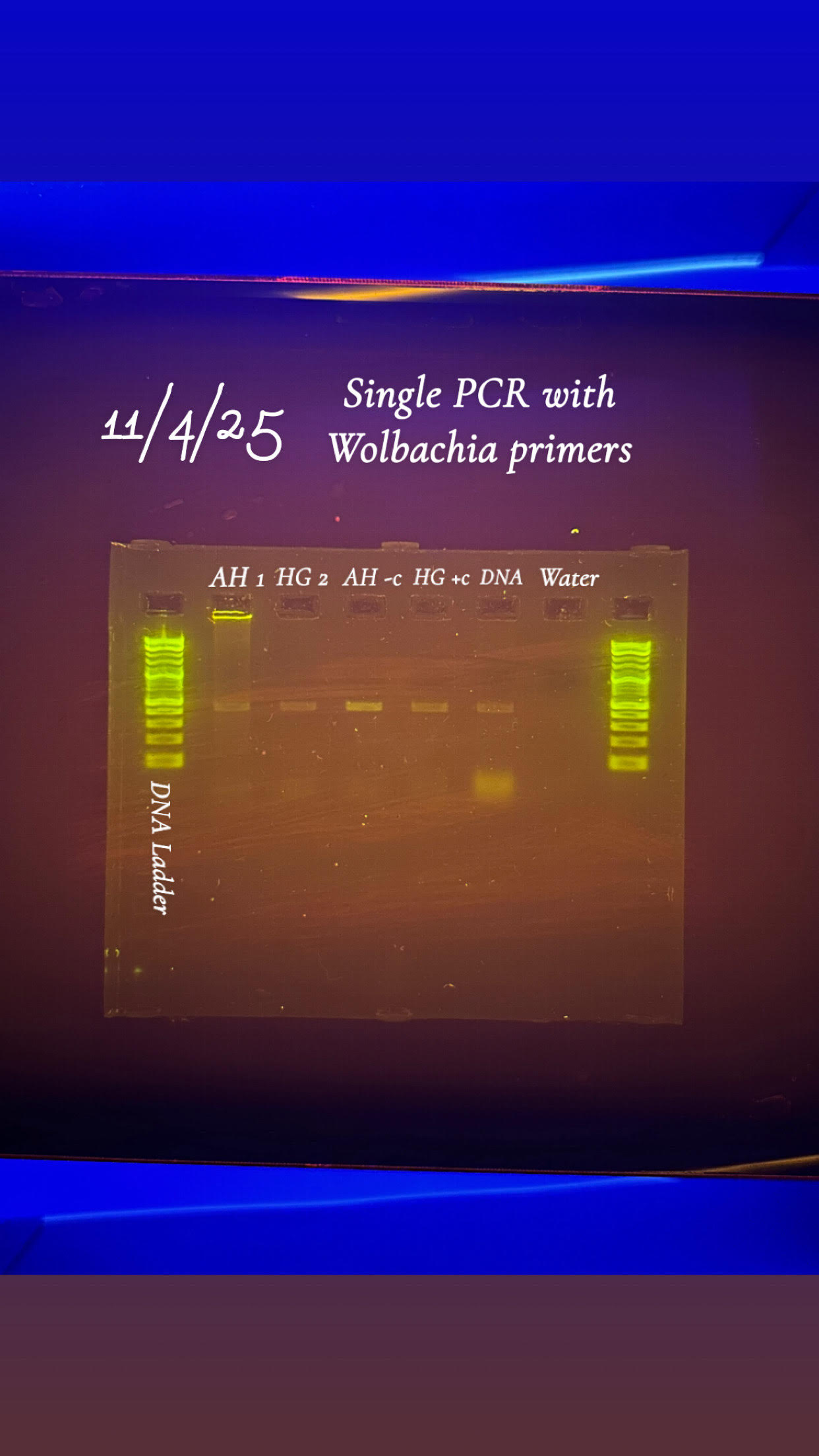 | Protocol notes | We used a DNA extraction protocol based on the insect adaptation of New England Biolab’s Monarch Spin gDNA Extraction kit. (Product #T3010) The specimen was incubated for 30 minutes but checked every 15 minutes to vortex. Our first PCR reaction was set up on 10/14/25 and was a duplex reaction because we used both the arthropod C01 and Wolbachia 16s primers together. Then used an annealing temperature of 49 degrees Celsius. we used this Taq polymerase: New England Biolab’s OneTaq Hot Start Quick load 2X Master Miz with Standard Buffer (#M0488S)