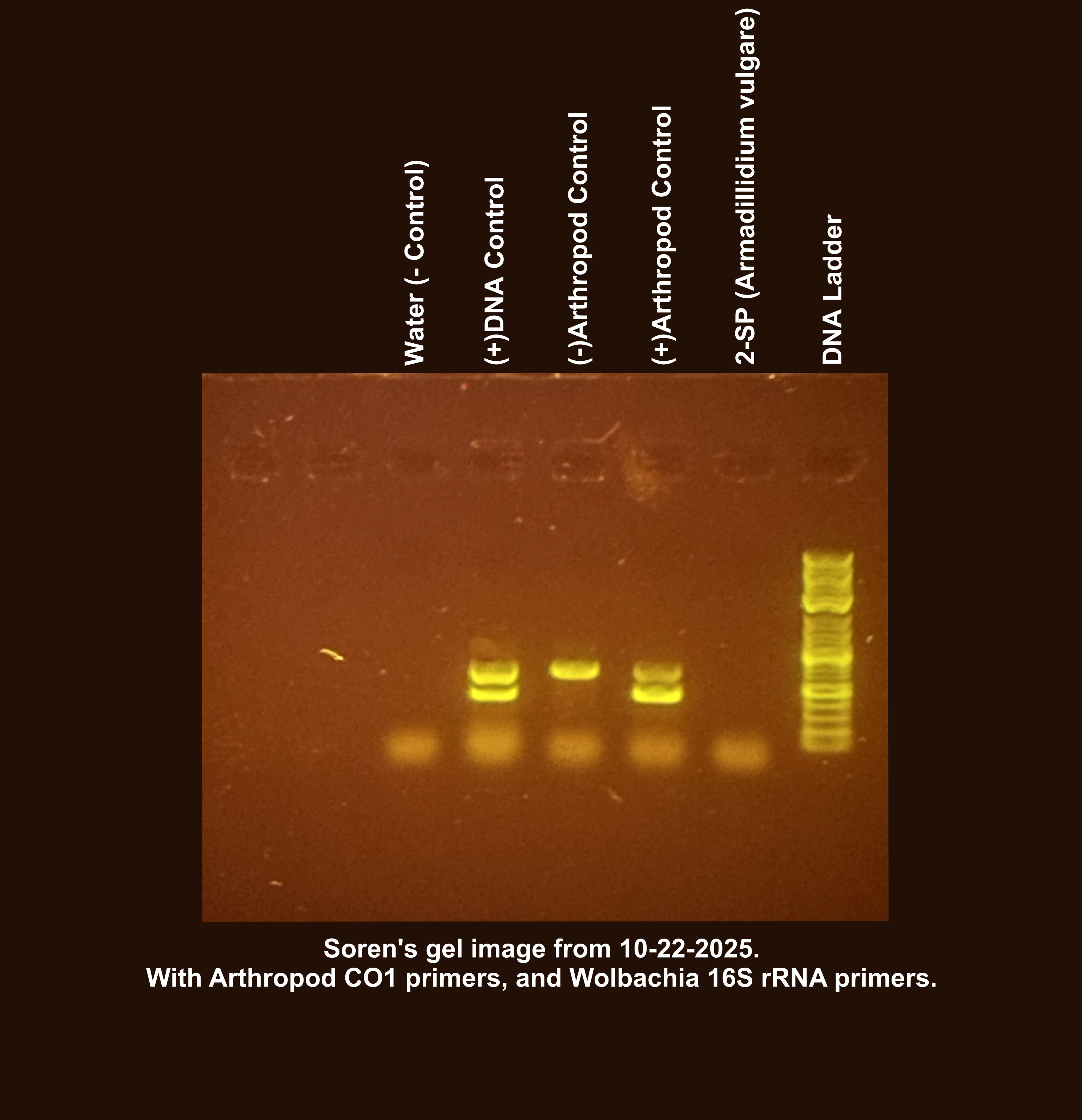 Our first PCR reaction was set up on 10/15/2025 and was a duplex reaction because we used both the Arthropod CO1 and Wolbachia 16S primers together. We used an annealing temperature of 49 degrees Celsius. We used this Taq polymerase: New England Biolabs OneTaq Hot Start Quick-Load 2X Master Mix with Standard Buffer (#M0488S). Differed from the written protocol?