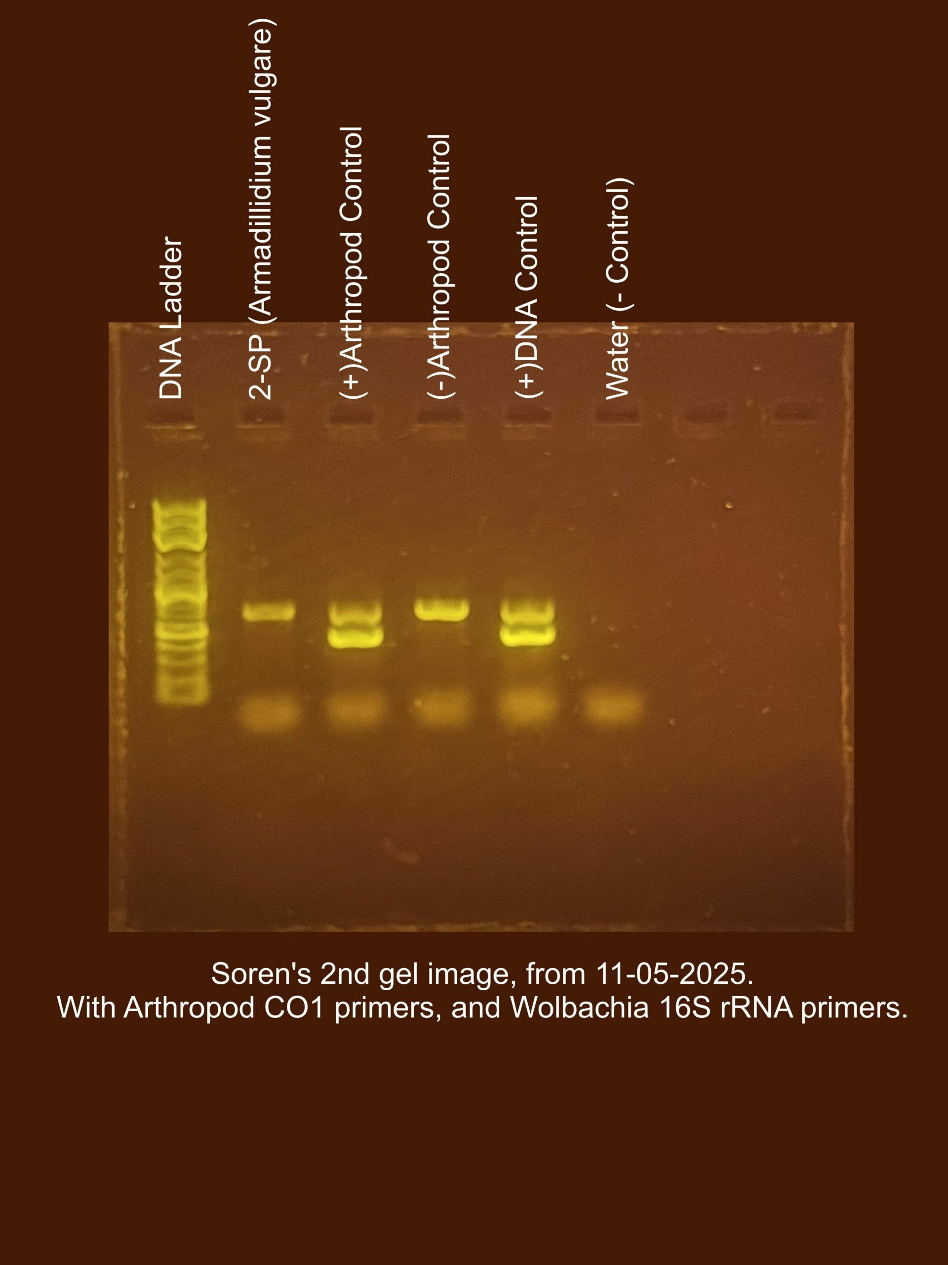 All the controls worked as expected. My sample (2-SP), however, showed no results, therefore I cannot determine whether my sample (2-SP) has Wolbachia, or not. This is why I have selected Unknown as my result. In the second Gel image taken on 11/5/2025 all results for the controls were as expected (same results as the first gel), but this time, my sample’s lane has a distinct band roughly 708bp, indicating that my sample (2-SP) contains arthropod DNA, but not Wolbachia DNA. Since all controls had the proper results, and the sample now shows the presence of Arthropod DNA, I am somewhat confident that my sample is negative for Wolbachia. The reason I am not highly confident is because my sample did not show any results until I increased the template DNA amount and ran another duplex PCR. The level of Wolbachia, if present, could still be too little to detect. |