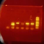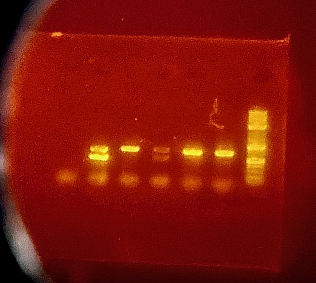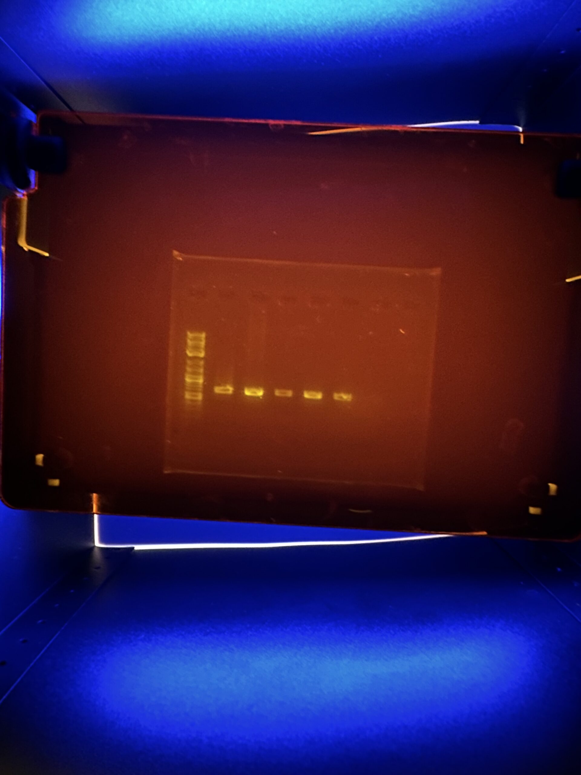 Our first Gel image was taken on 10/23/2025. It was run at 125 volts for 29 minutes. The DNA Ladder used was New England Biolabs 1kb Plus DNA Ladder for Safe Stains (product#N0559S