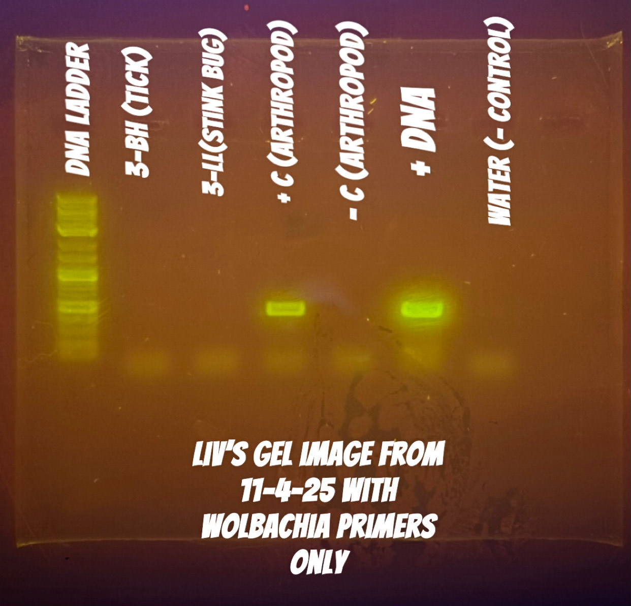 | Explanation of confidence level | I was highly confident that my arthropod would not be Wolbachia infected and I was correct. I know that I can trust these negative Wolbachia results because of my gel images. After the second PCR round I can see that my positive DNA and positive arthropod bands were around 400 bp whereas my arthropod band did not show up. This is direct evidence that my arthropod was negative for Wolbachia. |