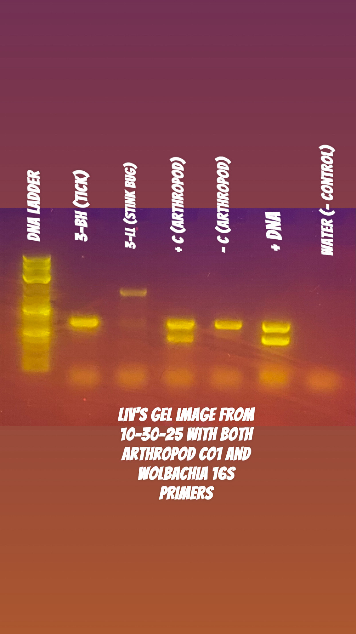 | Protocol notes | 1) We used a DNA extraction protocol based on the insect adaptation of New England Biolabs’ Monarch Spin DNA Extraction kit (Product # T3010) 2) The specimen was incubated for 40 minutes in hot water bath at 56 degrees C. 3) Details that differed from the written protocol were the change in pipette tips. During Cell Lysis when I was adding 10ul of PK to each tube, I completely forgot to switch out the pipette tips. Our first PCR reaction was set up on 10/16/25 and was a duplex reaction because we both used both Arthropod CO1 and Wolbachia 16S primers together. An annealing temperature of 49 degrees Celsius was used. This Taq polymerase: New England Biolabs One Taq Hot Start Quick-Load 2X Master-Mix with Standard Buffer (#M0488S) was used.