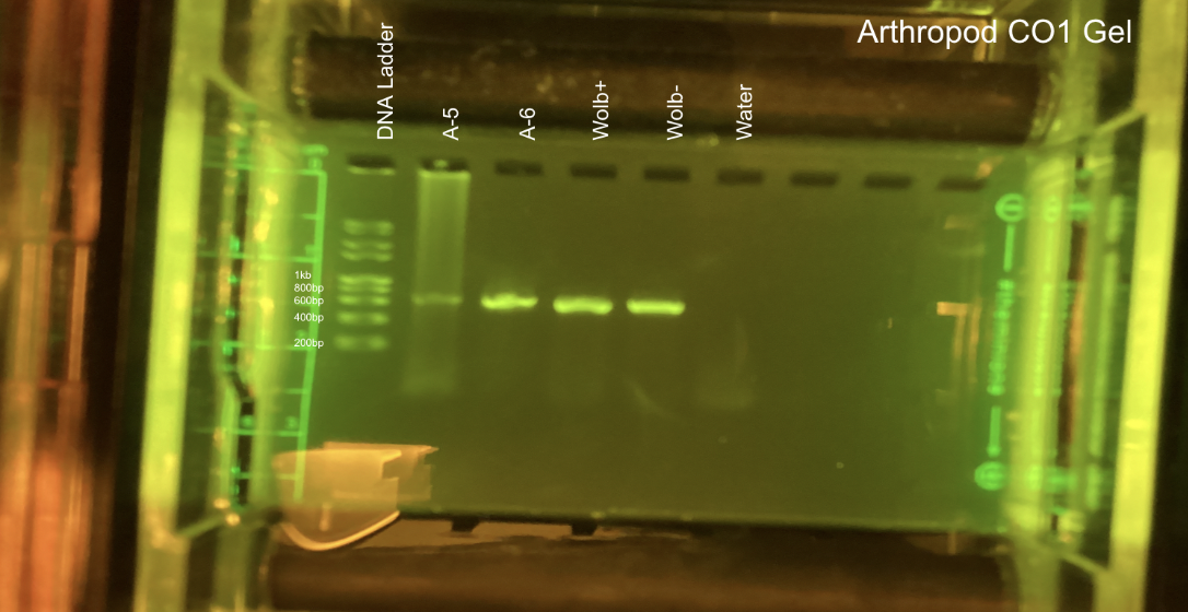 Gel electrophoresis, Arthropod CO1: We used two different machines for the CO1 gel electrophoresis machines. For machine 1: Lane 1 – DNA Ladder Lane 2 – Arthropod A-1 Lane 3 – Arthropod A-2 Lane 4 – Arthropod A-3 Lane 5 – Arthropod A-4 Lane 6 – Wolbachia (+) control Lane 7 – Wolbachia (-) control Lane 8 – Water Lane 9 – Blank