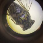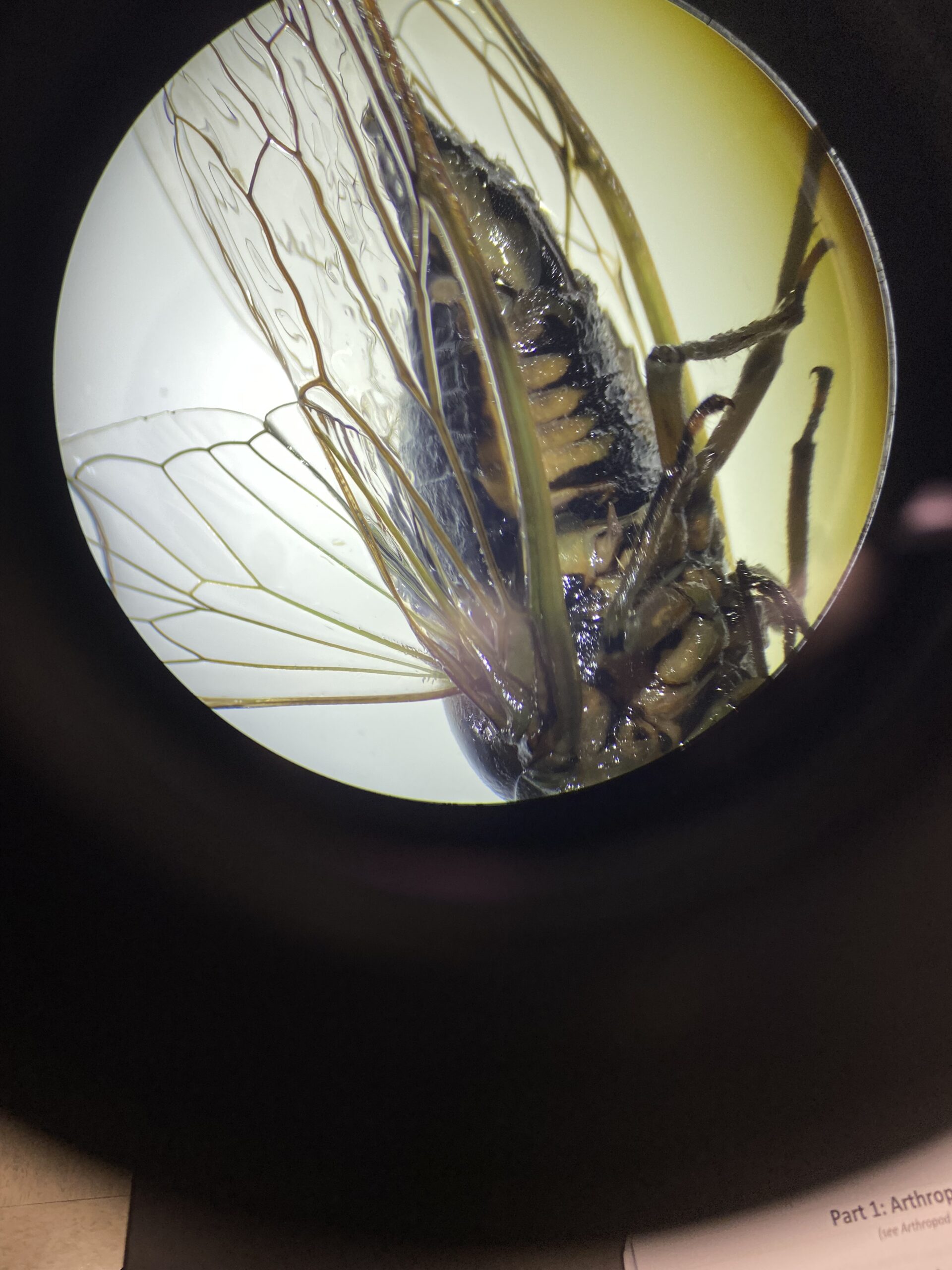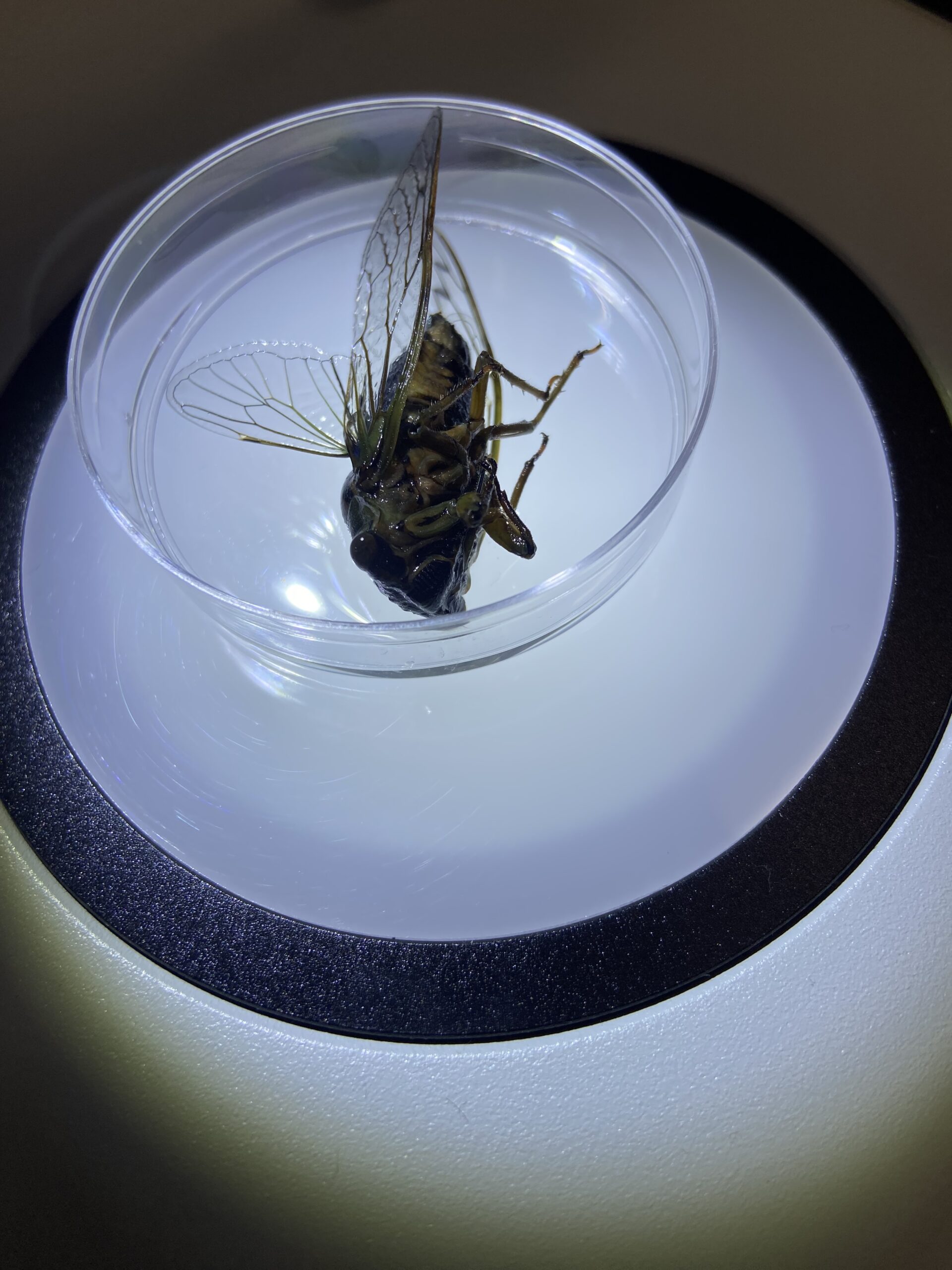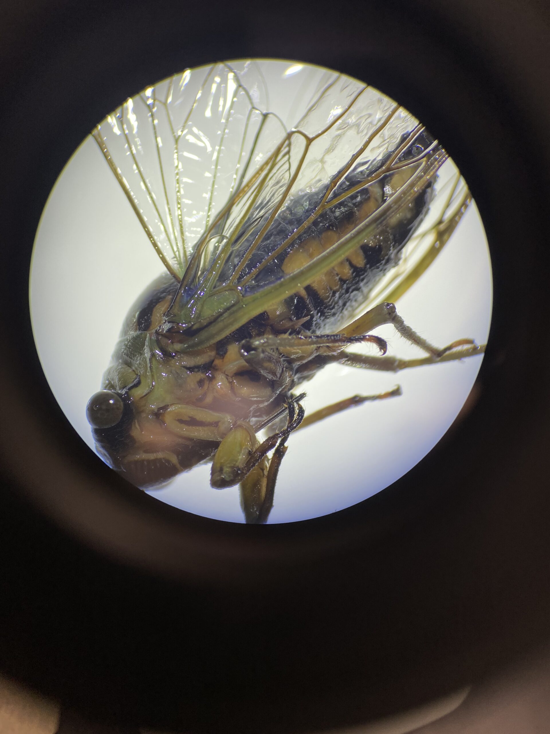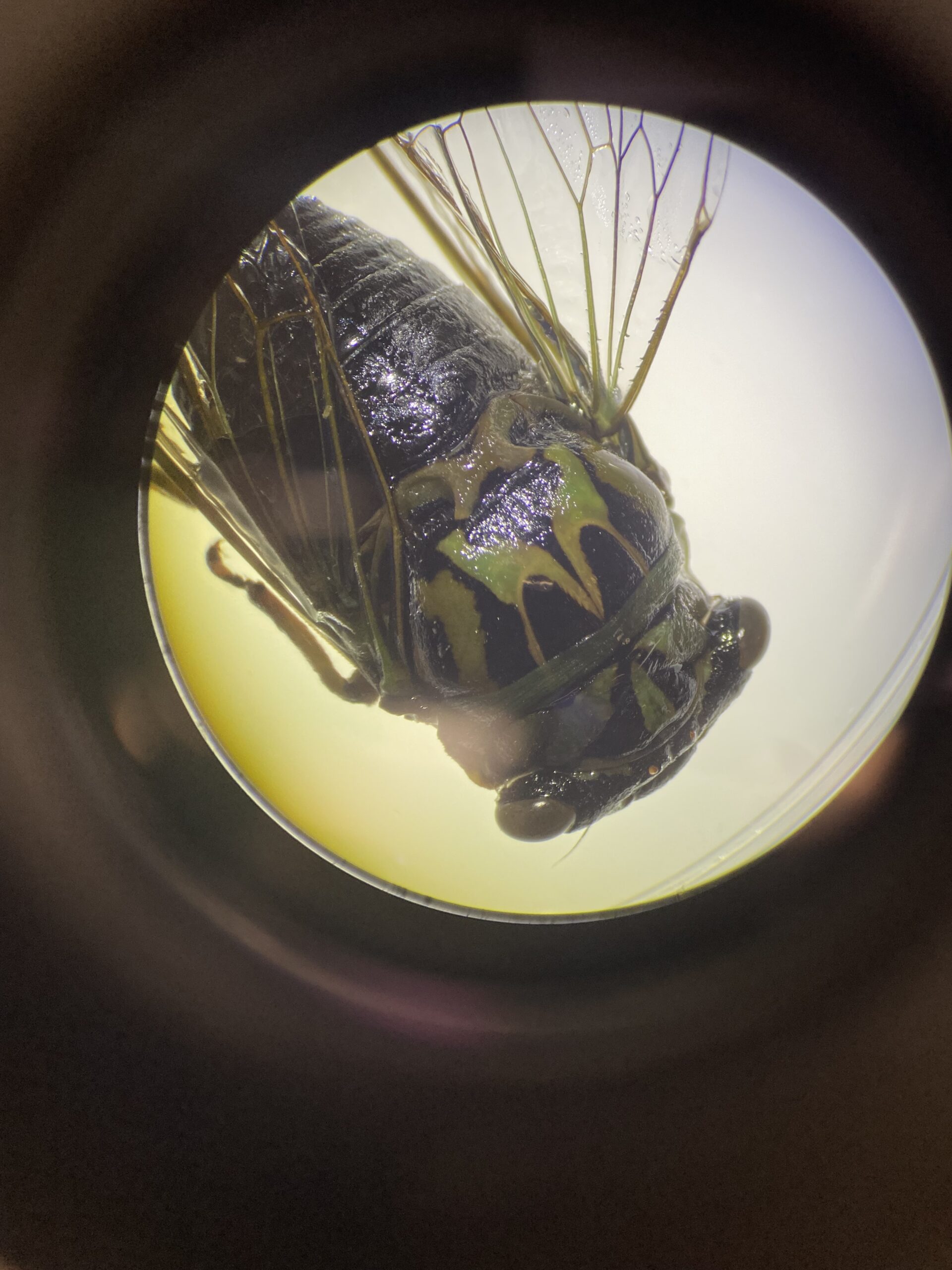 | Observations | Caught outside on a driveway in a fairly wooded, suburban area. Caught in late summer. Weather was cloudy, 89 degrees, with 63% humidity. It seemed old and was less squirmy than the other cicada. In comparison, its colors were more muted and less shiny. Top wing on each side is tall and somewhat narrow, standing straight up from the side of the thorax. Bottom wing is shorter and longer, sitting against the side of the abdomen. All wings are very thin. Wings are translucent with strong green and yellow veins. Some edges of the wings are veined, with an especially thick vein on the bottom edge of the bottom wing. It has 4 wings and 6 legs. The foreleg has a thick ovular upper part and a much thinner lower part of the leg. The lower part of the foreleg is bent towards the abdomen. The hind legs has a thicker cylindrical upper part of the leg and thinner lower part that has small hairs. Hind legs appear longer than forelegs. The head is flat with a rounded, triangular face. The mouth is in the center of the face and takes up most of it. It is ridged and roughly rectangular. It has two eyes that are large and spherical. They are facing forward on either side of the face and protrude significantly. It has no antennae. The body has three regions and is roughly cylindrical with a smaller head. The abdomen is thickest closest to the thorax and the tapers off significantly. The top is mostly black with patches of green on the thorax and head. The bottom is brown and black. The legs and wing veins are green and brown. |