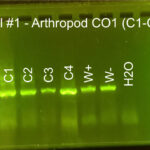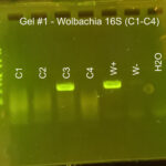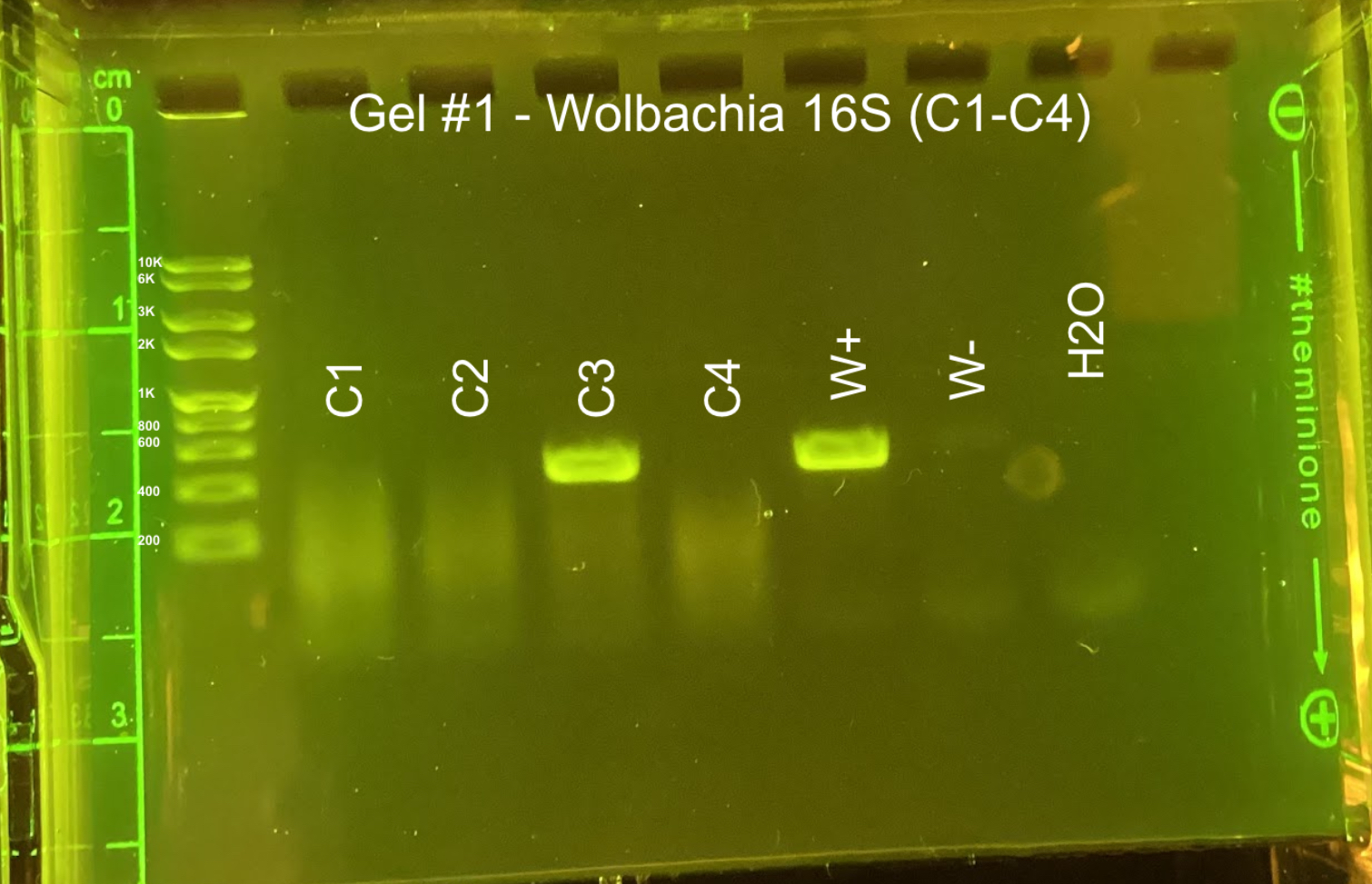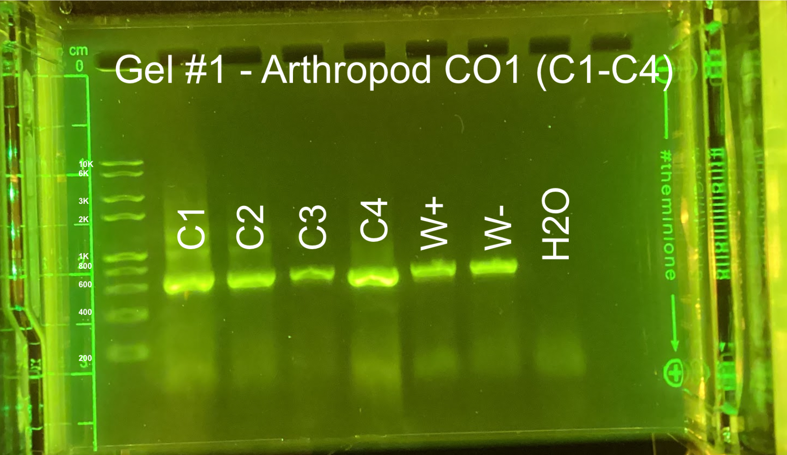 | Protocol notes | DNA extraction: Used the whole arthropod. Everything went as planned. PCR: We added two times the listed amount of ATL buffer and 10 extra microliters of Proteinase K. We had to split the sample into two tubes during DNA extraction and respin them several times. We recombined the tubes at the beginning of the PCR lab. Gel electrophoresis, Arthropod CO1: in lane 1 was the DNA ladder. C-1 was in lane 2, C-2 was in lane 3, C-3 was in lane 4, C-4 was in lane 5, W+ was in lane 6, W- was in lane 7, H2O control was in lane 8. No mistakes were made. Controls worked. Gel electrophoresis Wolbachia: DNA ladder in lane 1, C-1 in lane 2, C-2 in lane 3, C-3 in lane 4, C-4 in lane 5, W+ was in lane 6, W- was in lane 7, H2O control was in lane 8. No mistakes were made. Controls worked. |