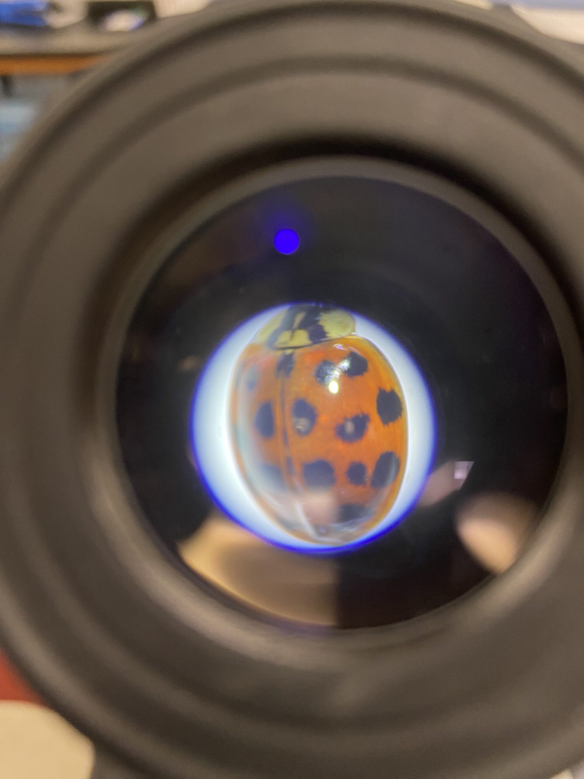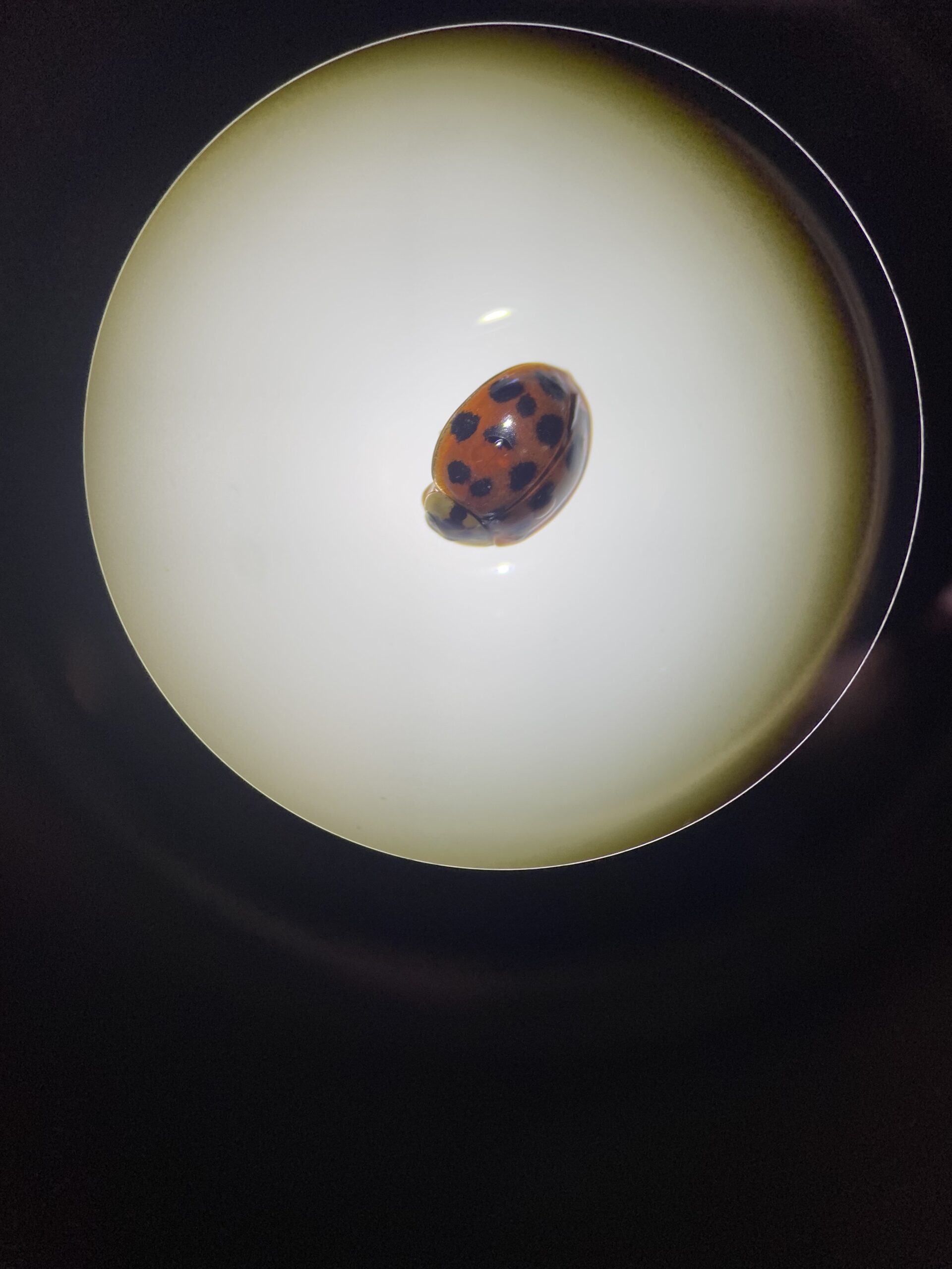 | Observations | Orange-red lady beetle with black spots. To short, straight antennae. 6 legs. 2 wings. Circular abdomen. Small head. Found inside the school. Late summer Temperature: 76Âș F Habitat: urban |
