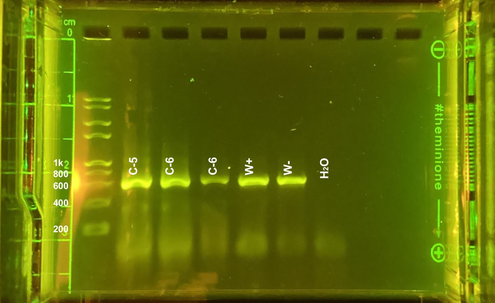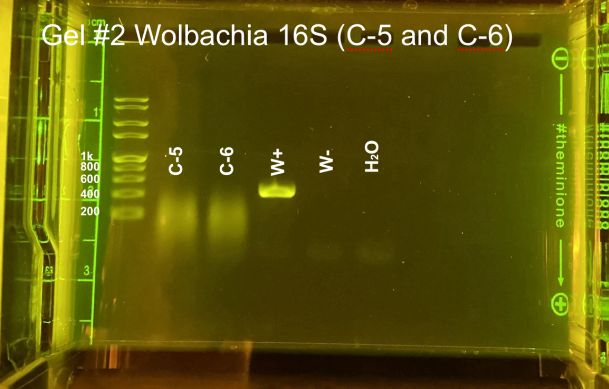 | Protocol notes | We added 10 extra microliters or Proteinase K during DNA extraction. We accidentally filled two wells with DNA in the CO1 gel, but no contamination. Gel electrophoresis, Arthropod CO1: DNA ladder in lane 1, C-5 in lane 2, C-6 in lane 3, C-6 in lane 4 (accidentally split C-6 into two lanes, but both showed the same results and there was no contamination.) W+ in lane 5, W- in lane 6, H2O control in lane 7. Controls worked. Gel electrophoresis, Wolbachia 16S: DNA ladder in lane 1, C-5 in lane 2, C-6 in lane 3, W+ in lane 4, W- in lane 5, H2O control in lane 6. No mistakes. Controls worked. The primer did not bind correctly for DNA sequencing, the quality scores were not high enough to blast. However, we are able to tell that it is a Spotted Lantern Fly because of its morphology and local knowledge. |