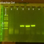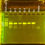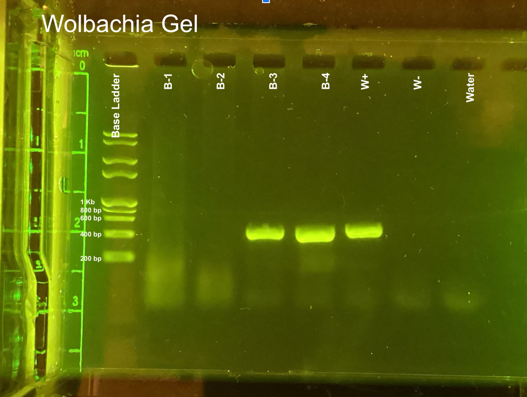 There was a band for Wolbachia in the B-4 lane of our gel. In the B1-4 lanes of the gel electrophoresis, we had the corresponding DNA for each arthropod. In the W+ lane was a Wolbachia positive control and in the W- lane was a Wolbachia negative control, and in the H20 lane was a water control. We also found bands for B3 and our W+ control. There was no band for arthropods B1-2 and our W- control. Our controls worked as intended meaning that we can confidently say that B-4 was infected with Wolbachia.