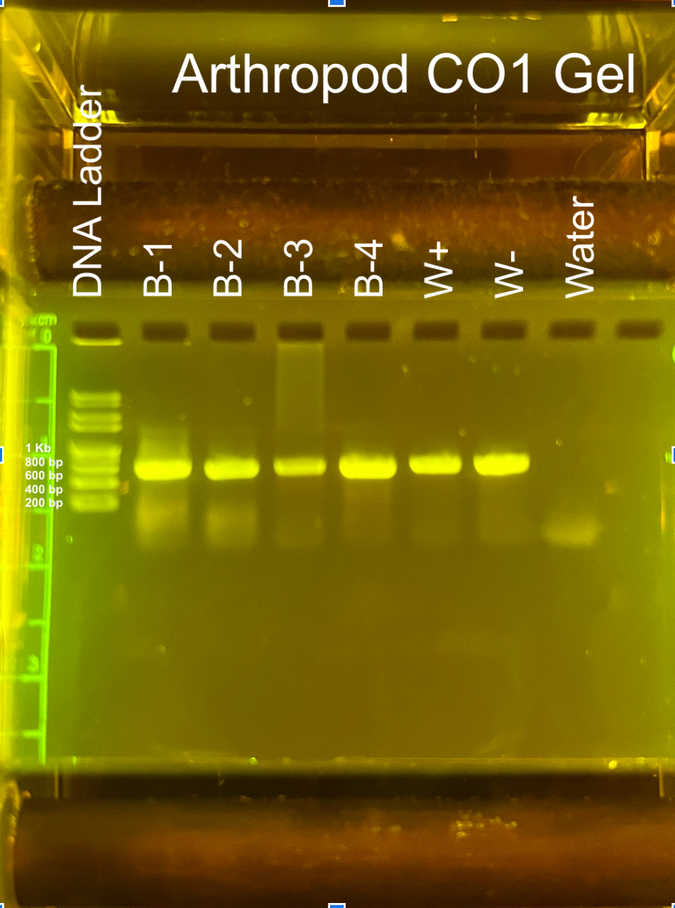 In the arthropod gel we found a band signaling that B-4 was indeed an arthropod. In the B1-4 lanes of the gel electrophoresis, we had the corresponding DNA for each arthropod. In the W+ lane was a Wolbachia positive control and in the W- lane was a Wolbachia negative control, and in the H20 lane was a water control. We also found bands for arthropods B1-3 and our W+ and W- controls. Our controls worked meaning that we are confident in the results. We had no mistakes in this process such as contamination.