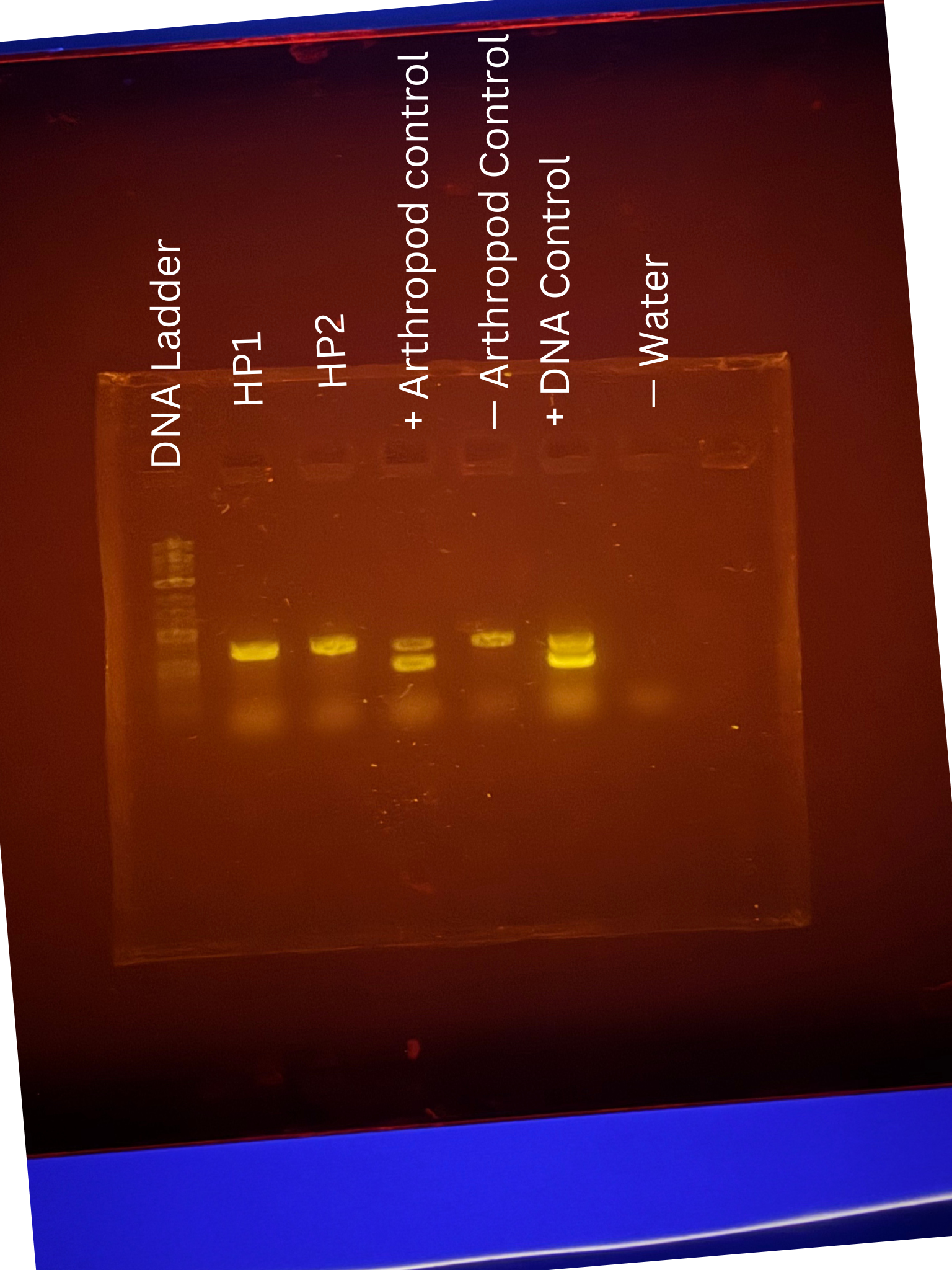 | Explanation of confidence level | We aren’t very confident in our confidence level because this would be the first one that we perform that actually gives us valid results, but our results show that my arthropod (HP_2) is negative for wolbachia as no bands show around 400 bp. All of our controls were where they were supposed to, so that is also why our confidence is medium and now low because if we were to see bands on water, would mean we absolutely did something wrong. |