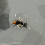 | Observations | The arthropod was found under a pot in the garden where it was attempting to burrow in damp, moist soil. The arthropod was found deep in the soil, not on the surface. The arthropod was moving very quickly on its appendage when trying to burrow in the soil. When the arthropod was in the collection container, it tried to hide in the dirt in the container. When agitating the container the arthropod moved around very quickly and even tried climbing up the walls. The arthropod has a rod like shape from the thorax to abdomen that is primarily black/dark brown with red coloration around the end of the abdomen. The head of the arthropod has antennae, while the end of it has a red, prong like structure. The thorax of the arthropod has 3 thin appendages one each side of the body. |