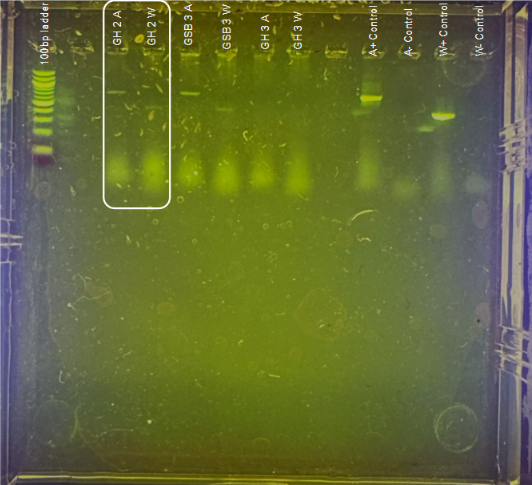 Analysis: The controls all worked, and although it was faint, there was a band present for both the arthropod and Wolbachia DNA from the sample. |