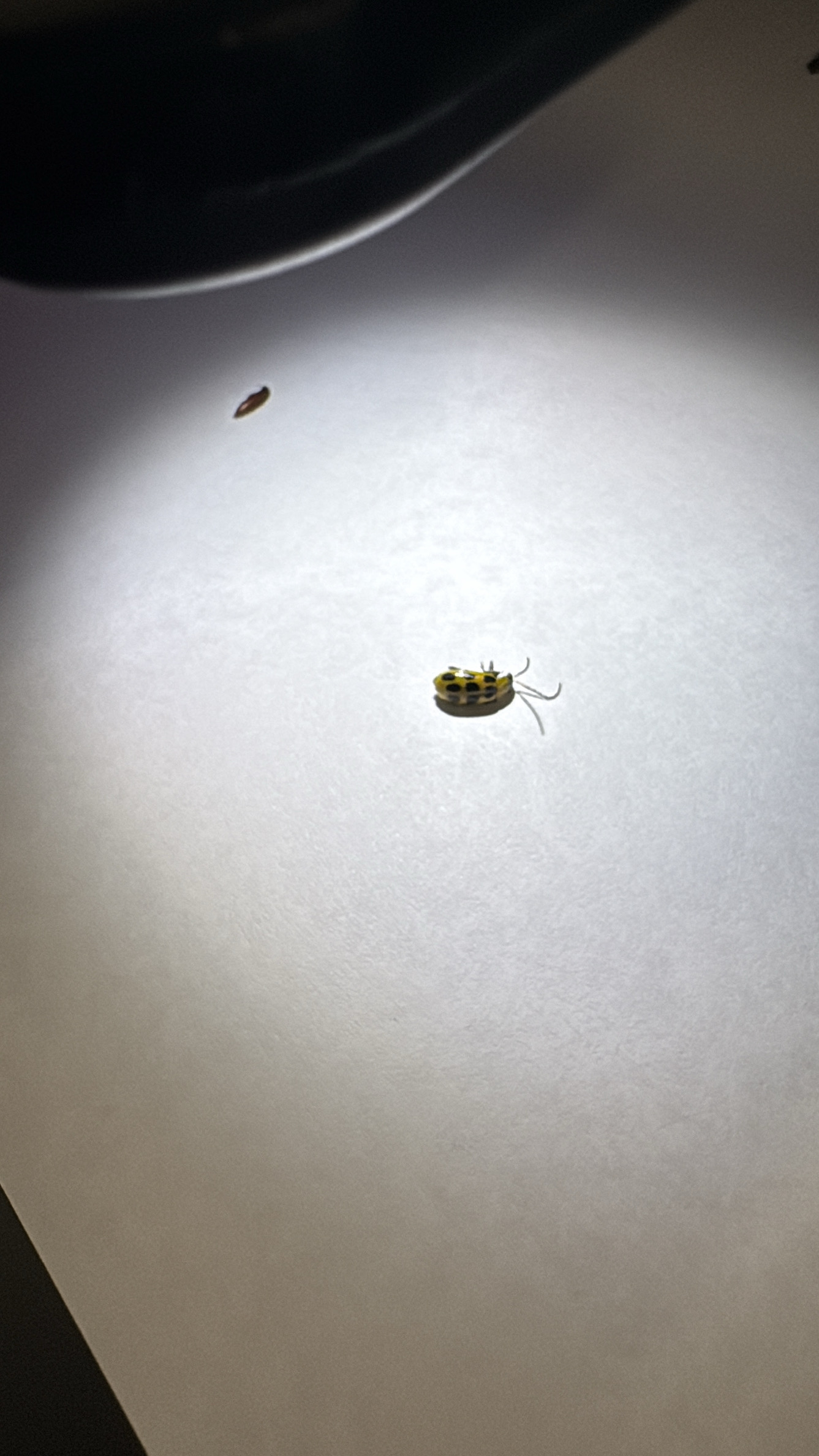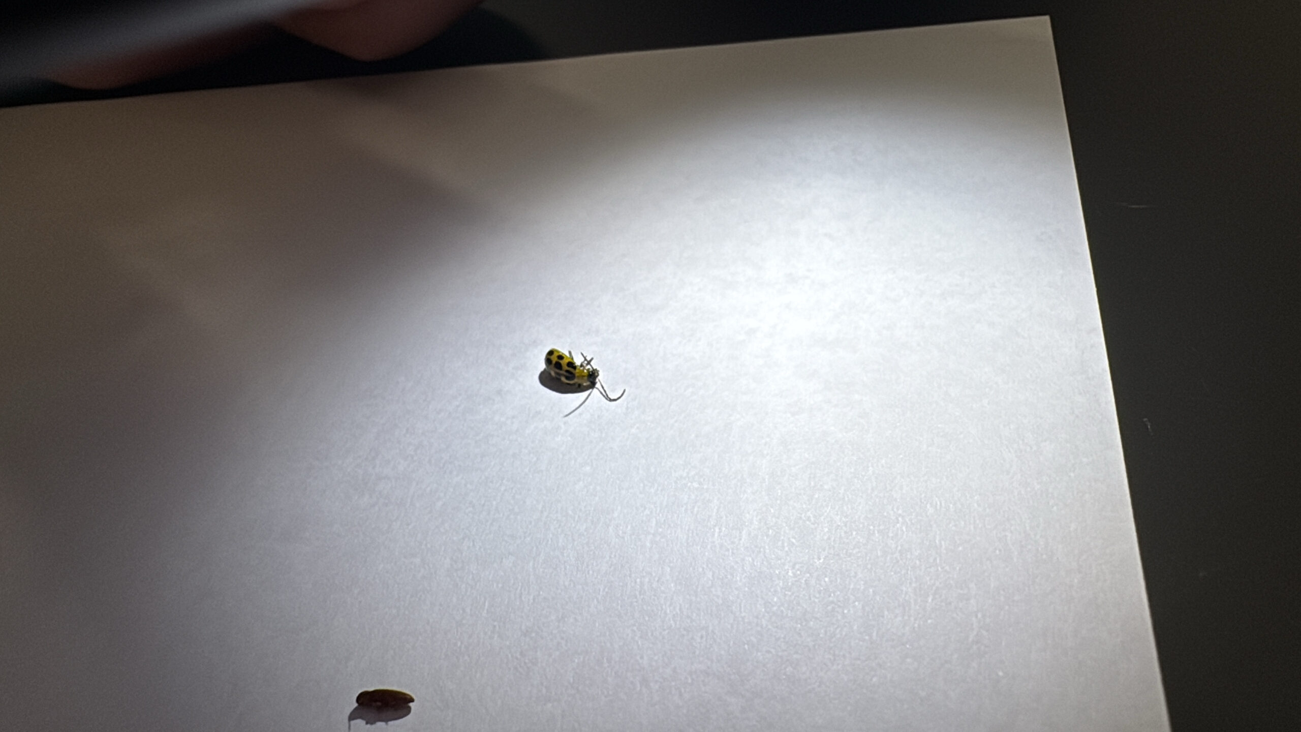 | Observations | We set up a sheet with an led light behind it, left it for an hour then folded the sheet up and used a jar to capture the bugs. |
