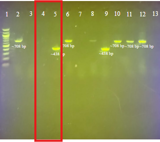 | Explanation of confidence level | For this kudzu bug sample, the bands indicative of both Arthropod (~708 bp) and Wolbachia (~438 bp) presence were observed during gel electrophoresis. The confidence level was deemed medium, since the Positive Wolbachia Control sample result was incorrect. |