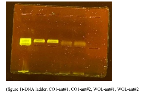 | Protocol notes | (Read from top to bottom) DNA ladder, CO1-ant#1, CO1-ant#2, WOL-ant#1, WOL-ant#2