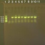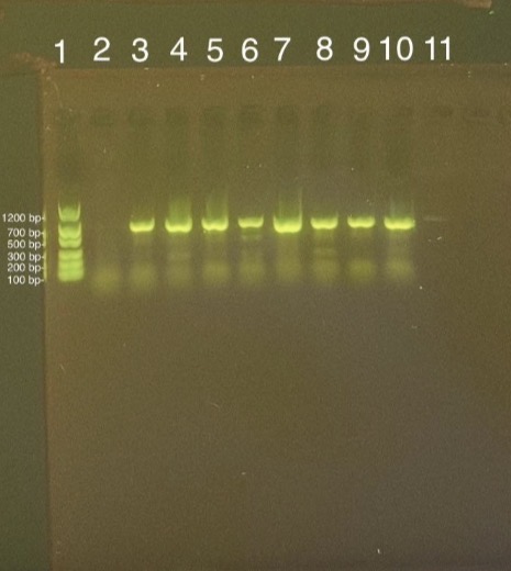 Figure 2: Gel electrophoresis showing Wolbachia DNA results, after 30 minutes after electrophoresis. The 1% agarose gel was stained with 0.5X GelGreen nucleic acid dye with 1X TBE buffer to visualize the DNA bands. Lane 1 contains a 100 bp DNA ladder, lane 2 contains LG wolbachia sample (old), lane 3 contains KC wolbachia sample (old), lane 4 contains a positive wolbachia control (old), lane 5 contains a negative wolbachia control (old), lane 6 contains RB wolbachia sample (old), lane 7 contains water, lane 8 contains a positive DNA control, lane 9 contains Termite DNA sample (new), lane 10 contains a positive wolbachia control (new), and lane 11 contains a negative wolbachia control (new)
