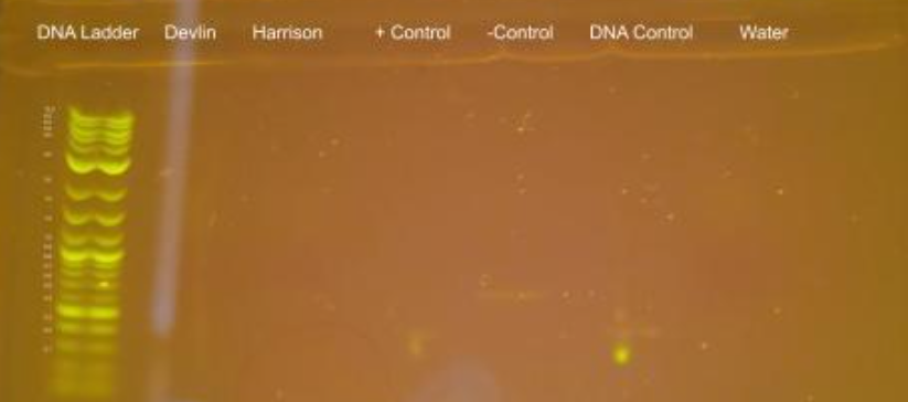 The PCR reaction likely failed, as demonstrated by the lack of bands in the controls. This means that there can be no certainty in the results of the reaction.