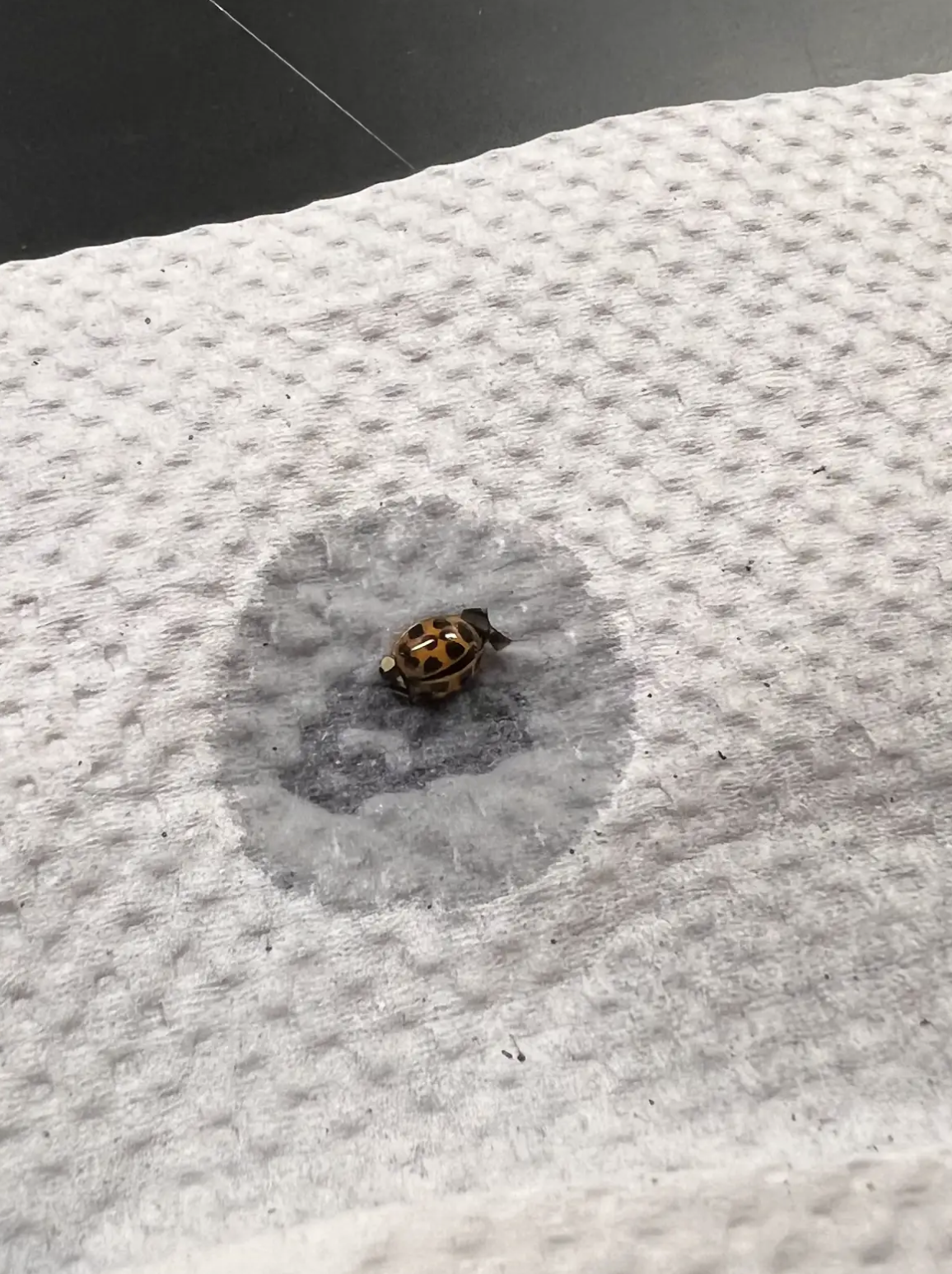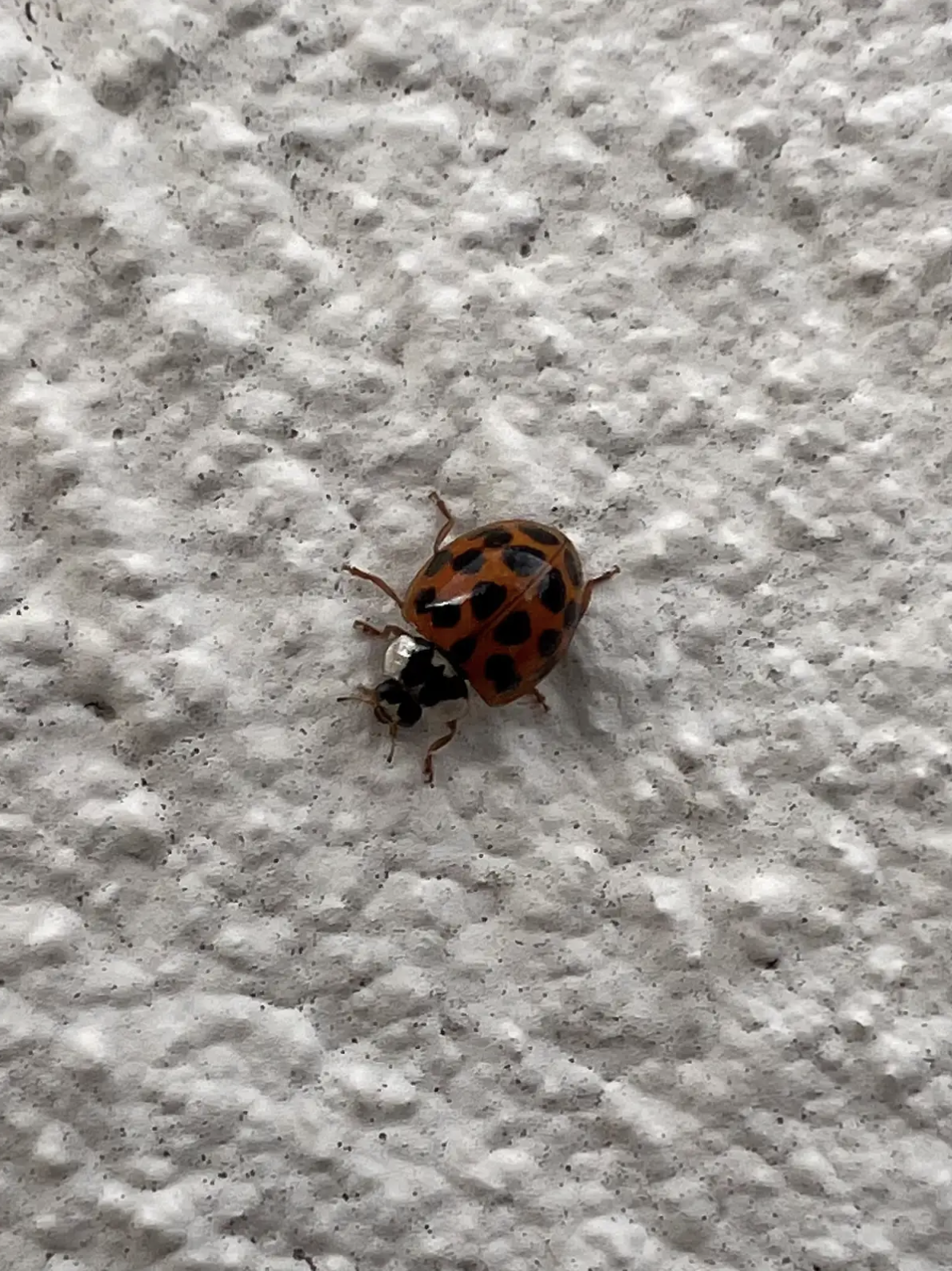 | Observations | a small (about 5-6 mm), round beetle that can be red, orange, or yellow with black spots and six legs |