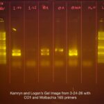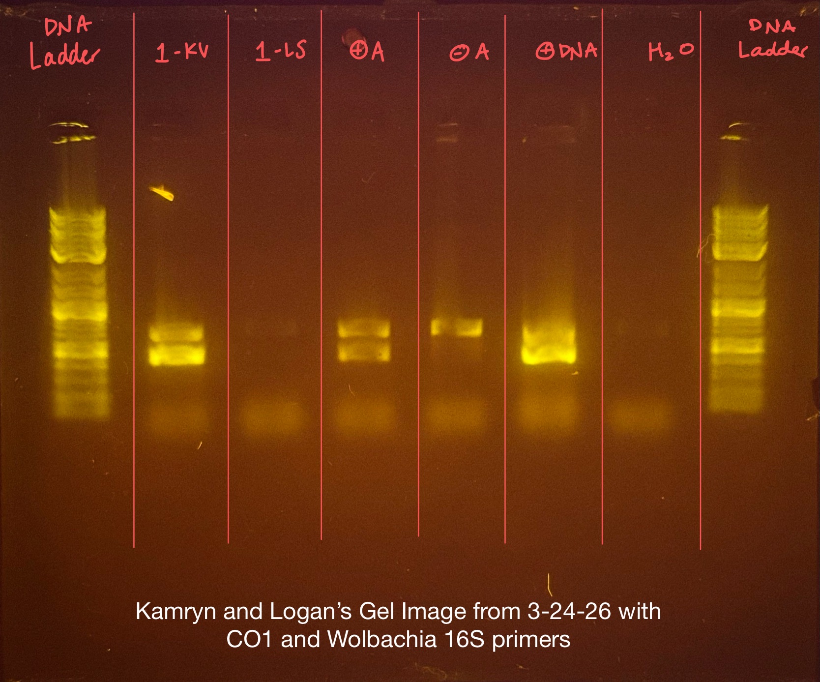 | Protocol notes | We used a DNA extraction protocol based on the insect adaptation of New England Biolabs’ Monarch Spin gDNA Extraction kit (Product # T3010). The specimen was incubated for 53 minutes in a hot water bath at 56 degrees C. The written protocol was followed closely. Our first PCR reaction was set up on 10 March 2026, and was a duplex reaction because we used both the Arthropod CO1 and Wolbachia 16S primers together. We used an annealing temperature of 49 degrees celcius and Taq polymerase – New England Biolabs OneTaq Hot Start Quick-Load 2X Master Mix with Standard Buffer (#M0488S). Our first gel image was taken on 3-24-2026 and was run at 120V for 25 minutes using the New England Biolabs 1 kb Plus DNA Ladder for Safe Stains (product # N0559S). |