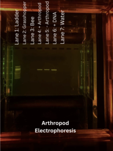 | Protocol notes | Followed MiniOne Protocol Lane 1: DNA Ladder Lane 2: Sample 1, Grasshopper Lane 3: Sample 2, Bee Lane 4: Positive arthropod control Lane 5: Negative arthropod control Lane 6: DNA positive control Lane 7: Water