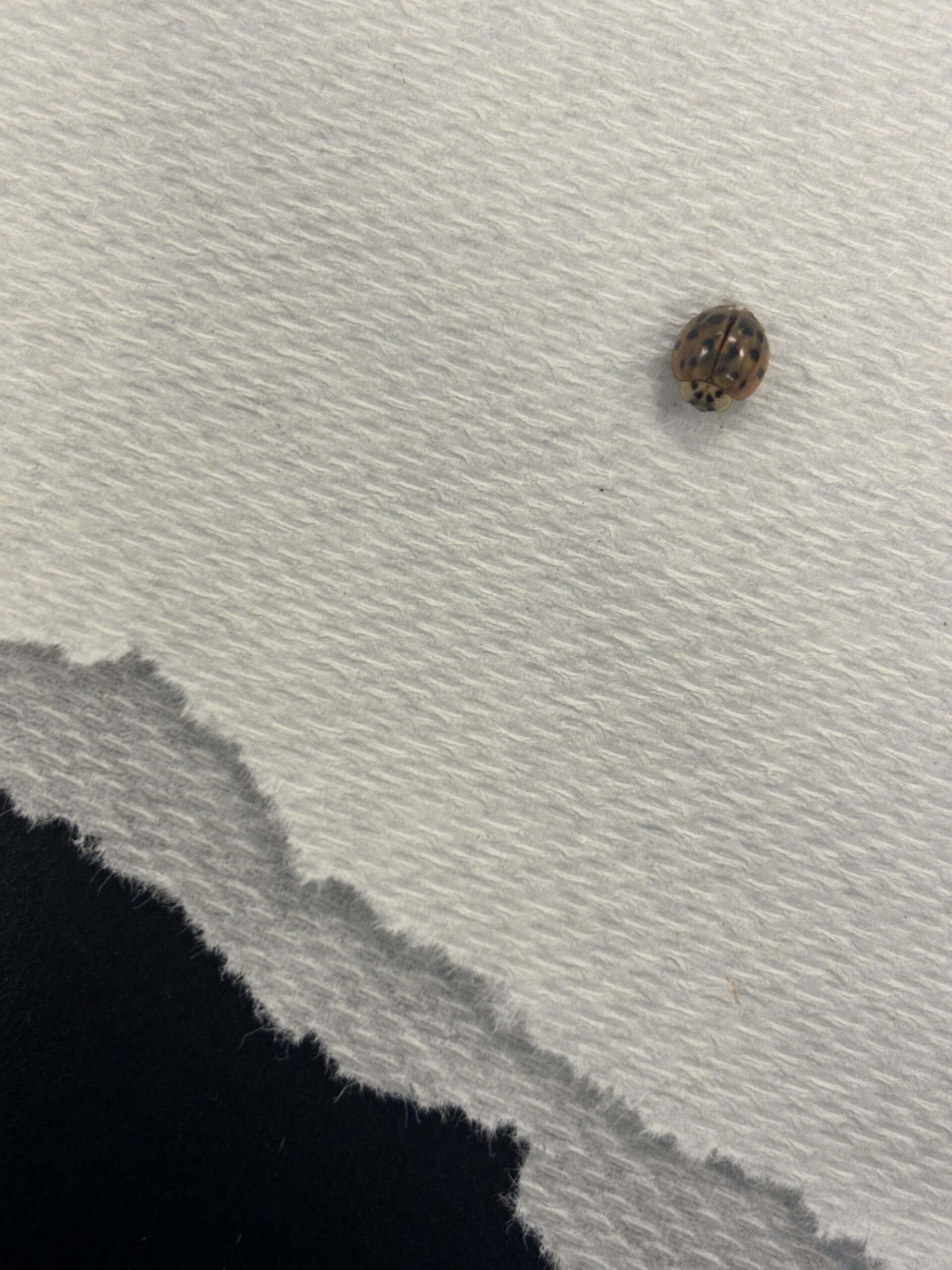 Small red beetle. Has hard shell with block spots. Observed on classmate shirt.