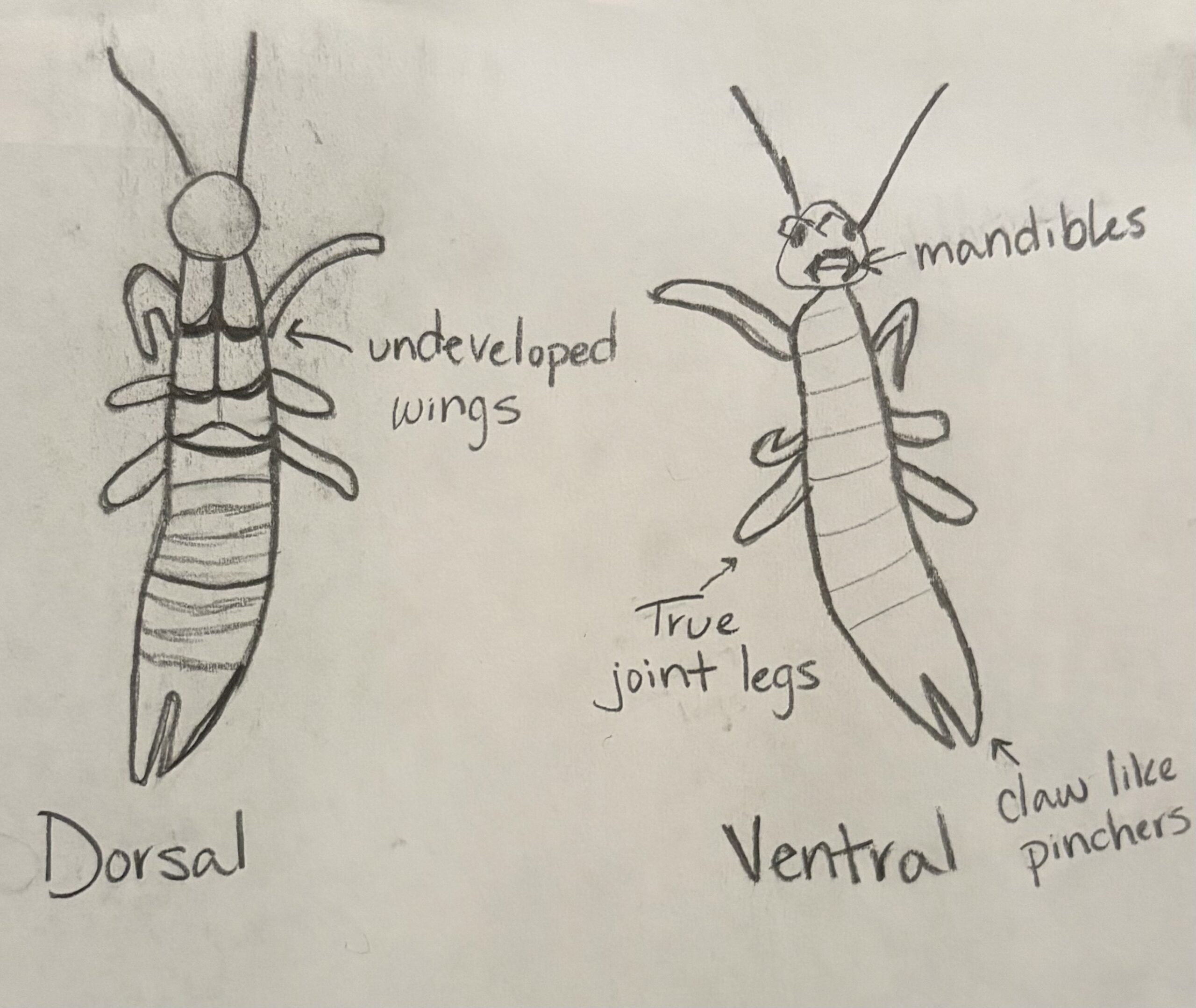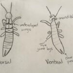 | Observations | Time of day: 10:00 am – 11:00 am Collection method: Beat net Description of habitat: Ground/dirt Description of location: Bushes by the science center at the armstrong campus Description of insect: Mandible, 6 true joint legs, pinchers |